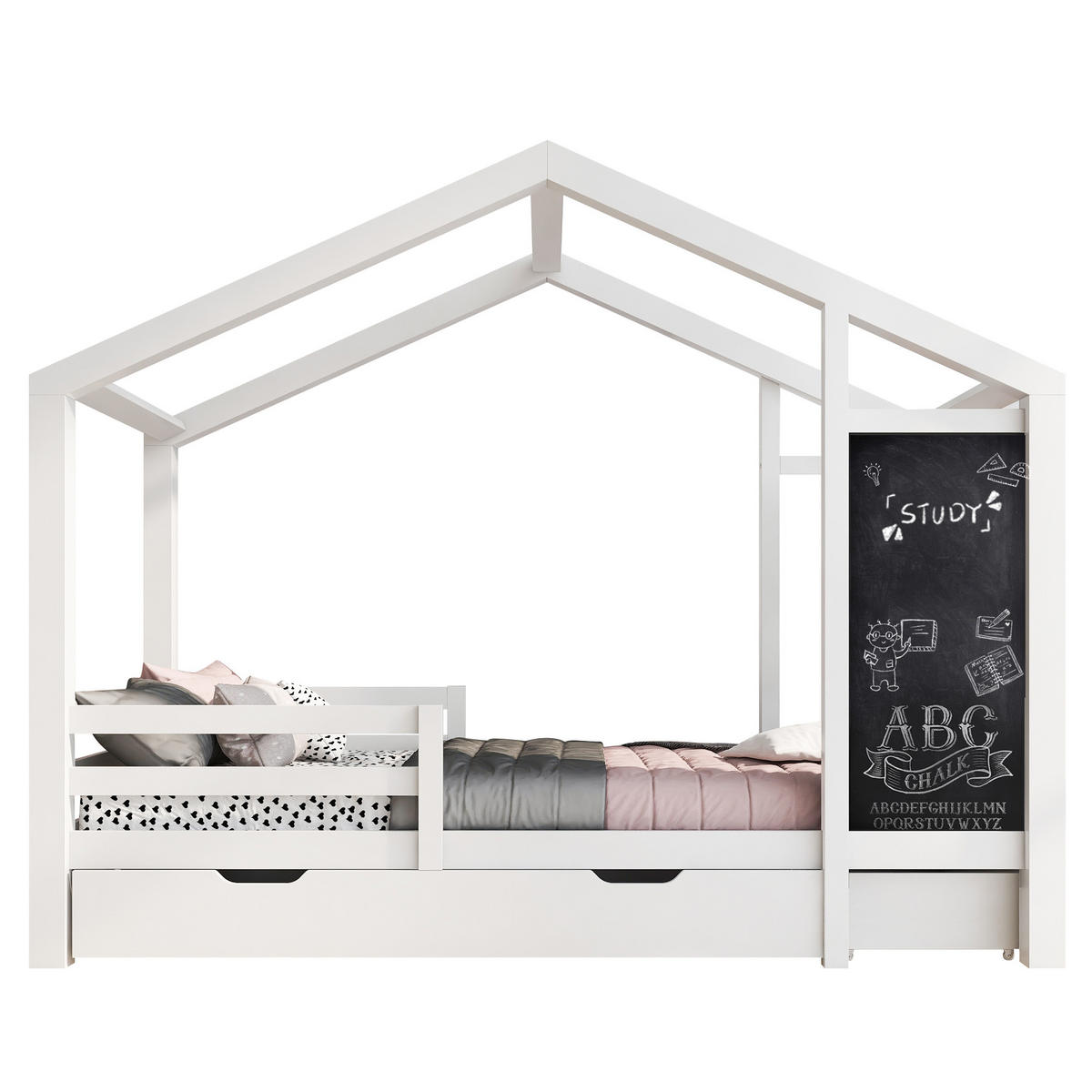 Redom KINDERBETT 90/200 cm mit Tafel, 2 Schubladen und dreiseitigem Rausfallschutz aus Massivholz, Weiß