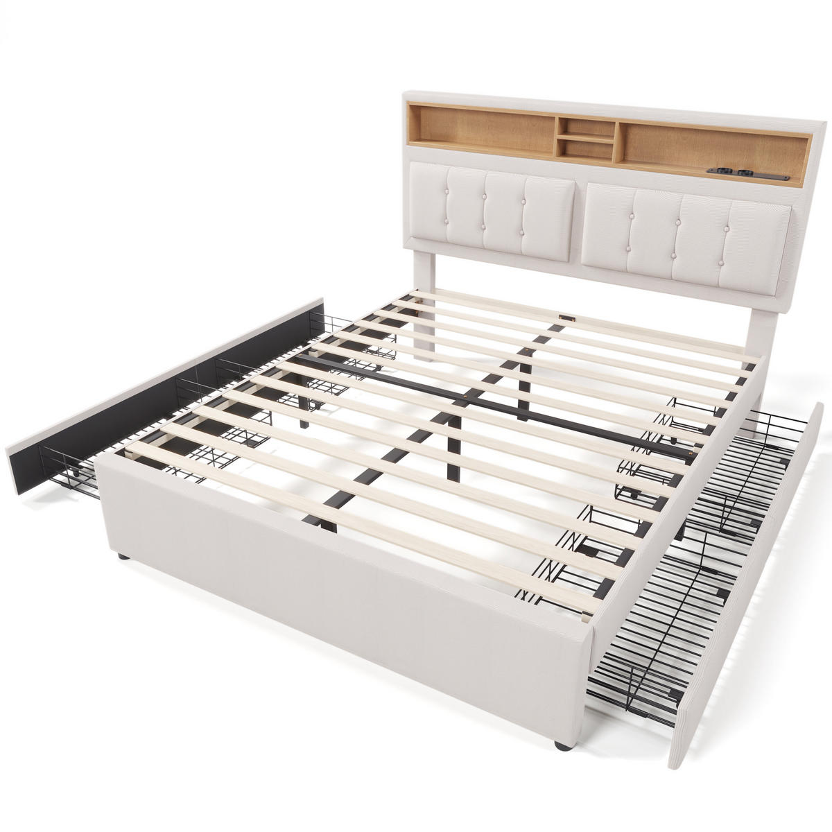 Im Alltag überzeugt das Bett mit integrierter Ladestation am Kopfteil: 1 USB-Anschluss, 1 USB-C-Anschluss und 2 Steckdosen erleichtern das Laden von Smartphone, Tablet oder Leselampe direkt am Schlafplatz. Vier Schubladen auf Rollen sowie vier Fächer im 50 cm hohen Kopfteil bieten großzügigen Stauraum für Kleidung und Alltagsgegenstände.