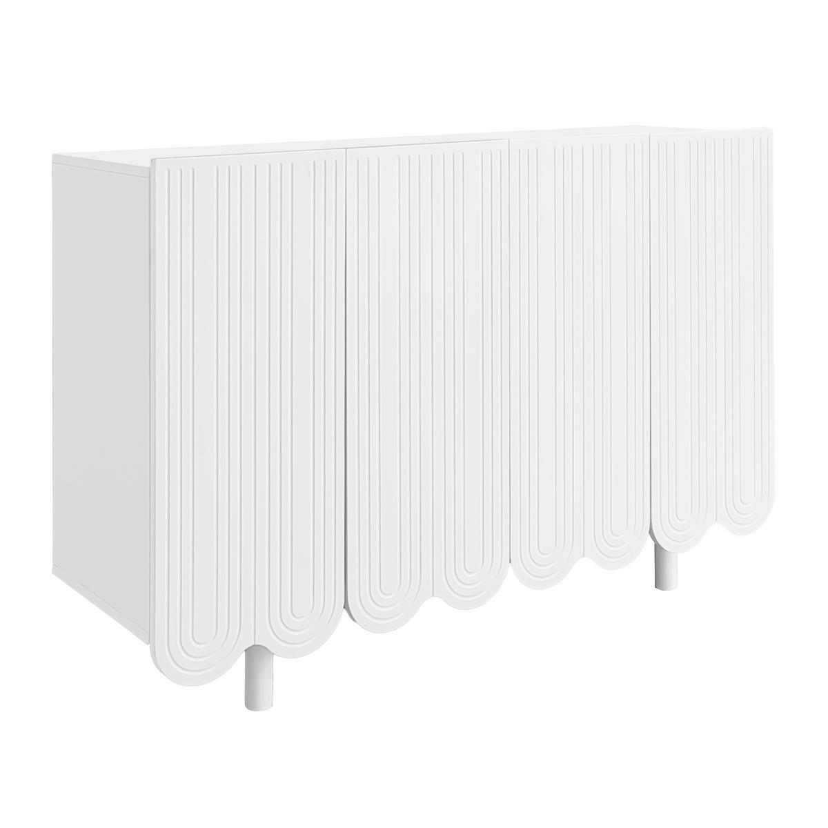 Dieses moderne Sideboard verbindet klare Linien mit dekorativen Details: Die vier Türen sind mit tropfenförmig geschnitzten Paneelen gestaltet und setzen einen stilvollen Akzent in Wohn- und Essbereich. Hinter jeder Tür sorgt ein integriertes Regal für