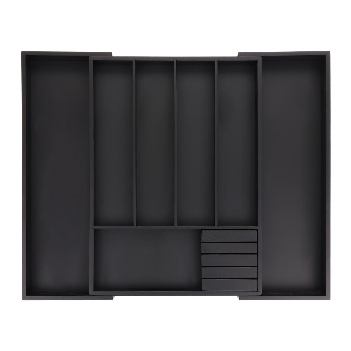 Unübersichtliche Küchenschubladen gehören mit diesem Besteckkasten der Vergangenheit an. Der Schubladeneinsatz mit 5 Haupt- und 2 Ausziehfächern bietet viel Platz für Ess- und Kochbesteck sowie verschiedene andere Küchenutensilien. Mit dem entnehmbaren Messereinsatz sind auch bis zu 4 Küchenmesser problemlos in der Besteckeinlage verstaut. Dank der individuell einstellbaren Breite passt sich der Besteckkasteneinsatz an unterschiedliche Schubladengrößen an.
