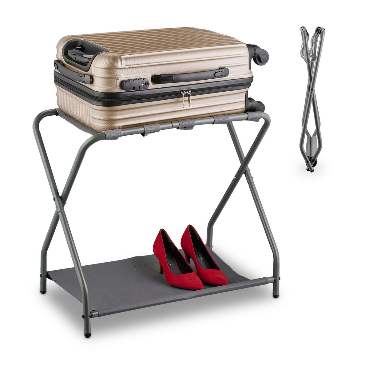 Für Hotels und Pensionen, die ihren Gästen so viel Komfort wie möglich bieten wollen, ist ein praktischer Kofferständer ein Must-have. Der Gepäckhocker ermöglicht ein rückenschonendes Ein- und Auspacken von Koffer und Reisetasche. Das stabile Kreuzgestell aus Metall und die strapazierfähigen Gurte sorgen dabei für einen sicheren Stand. Die zusätzliche Ablage erhöht den Stauraum und ist ideal für Schuhe. Bei Nichtgebrauch lässt sich der Kofferhocker platzsparend zusammenklappen und verstauen.