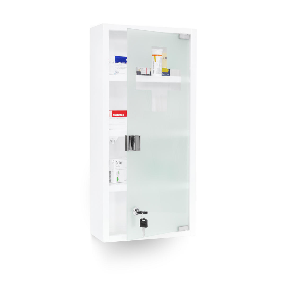 - Besonderheiten: Viel Stauraum auf 4 Ablagen Für Medikamente, Verbände & Hausapotheke Magnetisch schließende Glastür Kindersicher verschließbar, mit Ersatzschlüssel Stilvoll & hell in Bad oder Flur
