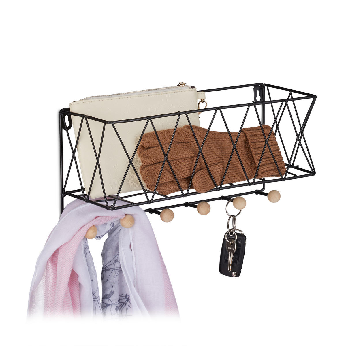 Das stylische Wandregal mit 6 Garderobenhaken ist ideal zum Aufhängen von Mänteln, Jacken, Hüten oder Schlüsseln. In dem oberen Gitterkorb können Accessoires wie Tasche, Schal oder Mütze verstaut werden. Die Haken aus hellem Holz bilden einen schönen Kontrast zum restlichen Regal aus pulverbeschichtetem Metall. Auch im Badezimmer zum Aufhängen von Handtüchern und Bademänteln und Verstauen von Badaccessoires macht das Metall Wandregal eine gute Figur.