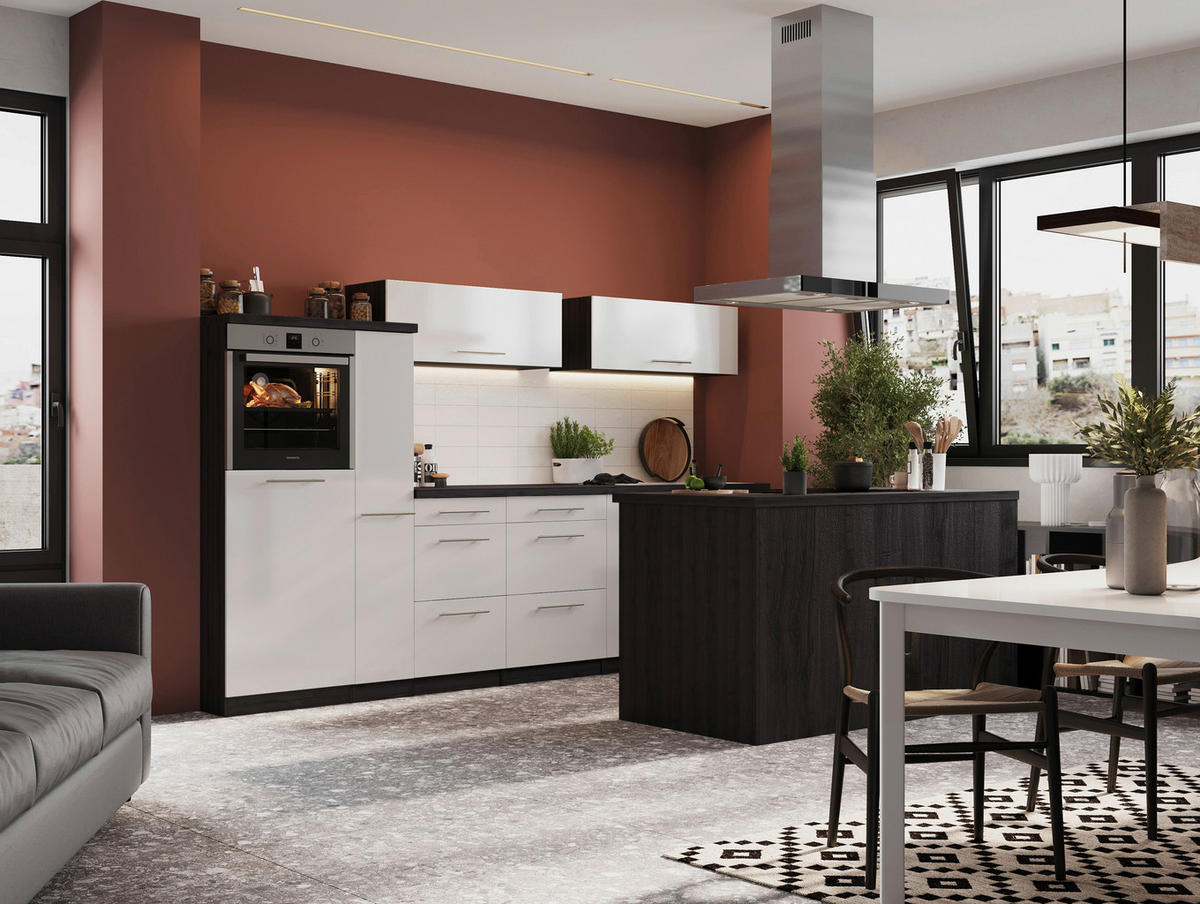 - Inkludierte Elektrogeräte: Dunstabzugshaube, Einbauherd, Geschirrspüler, Kühlschrank mit Gefrierfach, Glaskeramikkochfeld