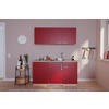 Diese Miniküche in Rot und Eichefarben bietet alles, was das Herz eines Küchenchefs begehrt. Dazu braucht es nicht unbedingt viel Platz - hier haben Sie auf ca. 150 x 60 cm (B x T) das benötigte Equipment sofort zur Hand. Hinter 5 Drehtüren und in einer Schublade sind Töpfe, Pfannen, Geschirr sowie weiteres Zubehör prima aufbewahrt.