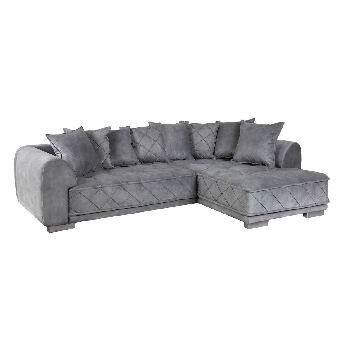 Unser modernes Ecksofa DECADENCIA bietet Dir die perfekte Kombination aus zeitlosem Design und höchstem Sitz- und Liegekomfort. Der silbergraue Samtbezug wurde mit auffälligen Ziernähten im Rautenmuster verziert, welche einmal an der Vorderseite und auf drei der Kissen zu finden sind. Den Abschluss eines gelungenen Gesamtlooks bilden die silbernen Füße, die das moderne Flair des XXL Sofas unterstreichen.