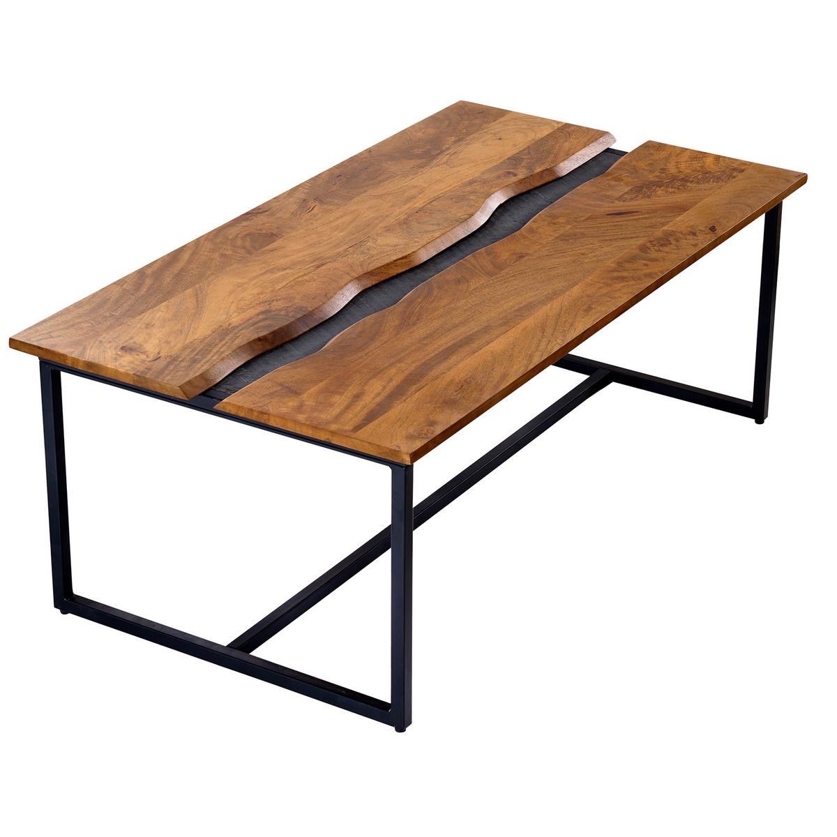 Industrial Design trifft auf natürliches FlairDu suchst einen ganz besonderen Blickfang für Dein Wohnzimmer? Dann solltest Du den außergewöhnlichen Couchtisch aus der Serie AMAZONAS nicht verpassen. Die Tischplatte besteht aus zwei massiven Holzelementen, die von einer dekorativen Platte in schwarzer Steinoptik unterbrochen sind. Sie harmoniert farblich hervorragend mit dem minimalistischen Gestell, das dem Couchtisch den gewissen Industrial Look verleiht. Als besonderes Highlight wurden die nach Innen liegenden Kanten der Holzplatten so bearbeitet, dass der ursprüngliche Charakter und natürliche Eindruck einer großen Baumscheibe entsteht.Ein Eyecatcher für Dein WohnzimmerDie charakteristische Maserung des Mangoholzes wird durch die bearbeitete Oberfläche besonders betont und erstrahlt in einem satten Honigton. Unser Interior-Tipp: Kombiniere den Tisch mit weiteren Möbelstücken aus Mangoholz, schwarzen Metall-Accessoires und natürlichen Materialien ? so verwandelst Du Dein Zuhause in Deinen ganz persönlichen Wohntraum!Hinweis: Da es sich um ein Naturprodukt handelt, ist jeder Tisch absolut einzigartig. Unebenheiten, charismatische Astlöcher, Risse oder auch Maßdifferenzen sind möglich und erzeugen Ursprünglichkeit und machen den Charme des Massivholzes aus. Dies sind alles keine Reklamationsgründe.