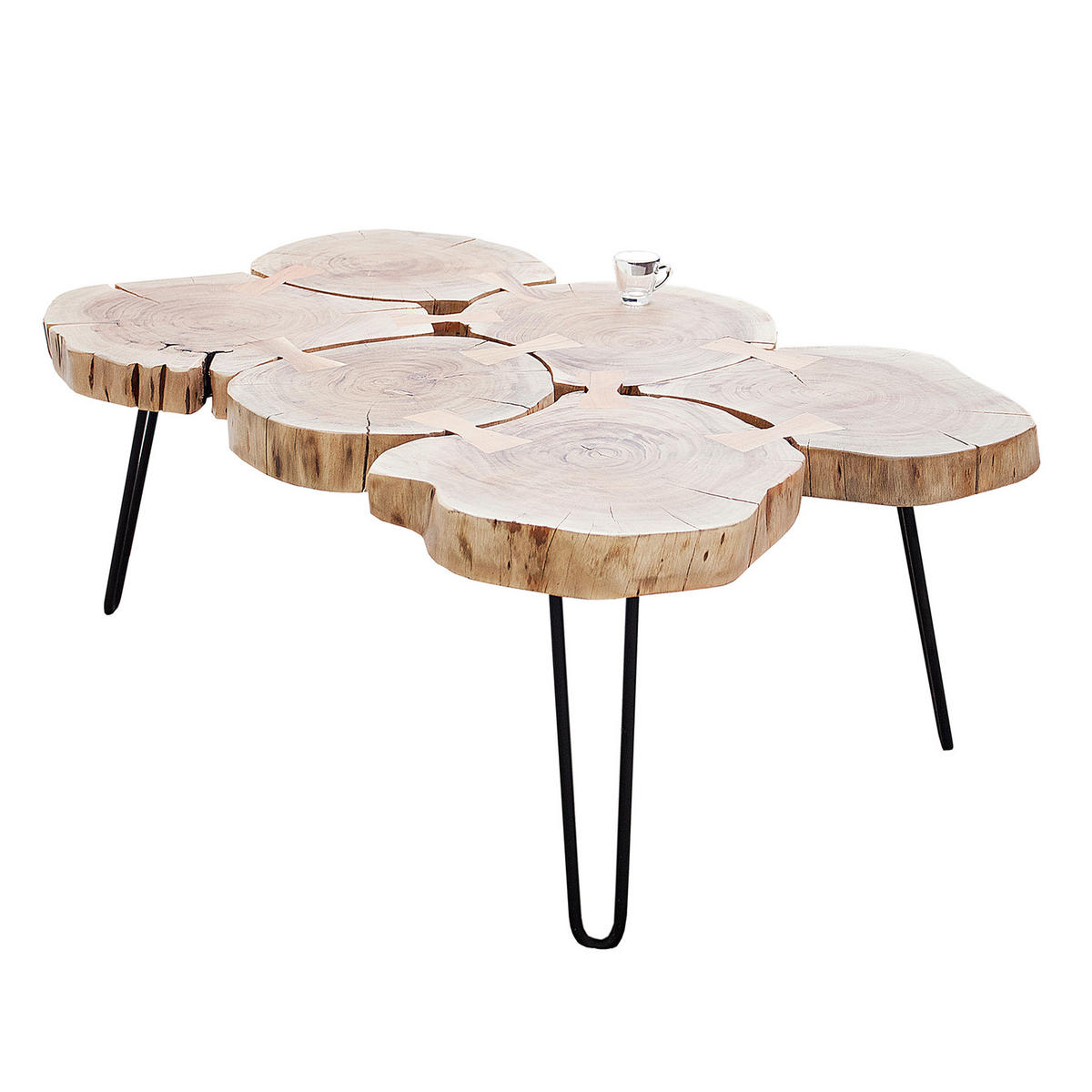 Du bist auf der Suche nach einem einzigartigen Couchtisch?Der charmante Couchtisch mit sechs naturbelassenen, ineinander verschlungenen Akazienscheiben als Tischplatte lässt sich besonders vielseitig in Deinen Wohnräumen integrieren. Ob als schickes Wohnmöbel oder besonders Platz bietende Ablage: Die edlen Baumstamm Scheiben setzen natürliche Akzente und werden zum absoluten Blickfang in jeder Räumlichkeit. Die Holzscheiben werden in einem aufwändigen Verfahren runtergetrocknet ? heraus kommen die charakteristischen Holzrisse, die dem Tisch seinen besonderen Charakter verleihen. Die Jahresringe und die natürlich gewachsene Form machen den Tisch zu einem echten Unikat.Dieser Wohnzimmertisch aus Massivholz lässt die Herzen von Designfans höher schlagenDie aufwendig getrockneten und ökologisch gewachsten Akazienbaumscheiben verbreiten in Deinen Wohnräumen ein natürliches und individuelles Ambiente. Eine Rarität, die dank ihrer liebevollen Verarbeitung für schöne Wohnmomente sorgt. Wenn Du Dein Zuhause im angesagten Skandinavian Design einrichten möchten, ist dieser Wohnzimmertisch ein absolutes "Must Have"! Dank seiner klaren Linien und dem zurückhaltenden Design lässt er sich aber auch mit vielen anderen Einrichtungsstilen kombinieren ? probiere es aus!Hinweis: Da es sich um ein Naturprodukt handelt, ist jedes Exemplar absolut einzigartig. Unebenheiten, Farbverläufe, charismatische Astlöcher, Risse oder auch Maßdifferenzen sind möglich und erzeugen Ursprünglichkeit und machen den Charme des Massivholzes aus. Dies sind alles keine Reklamationsgründe.