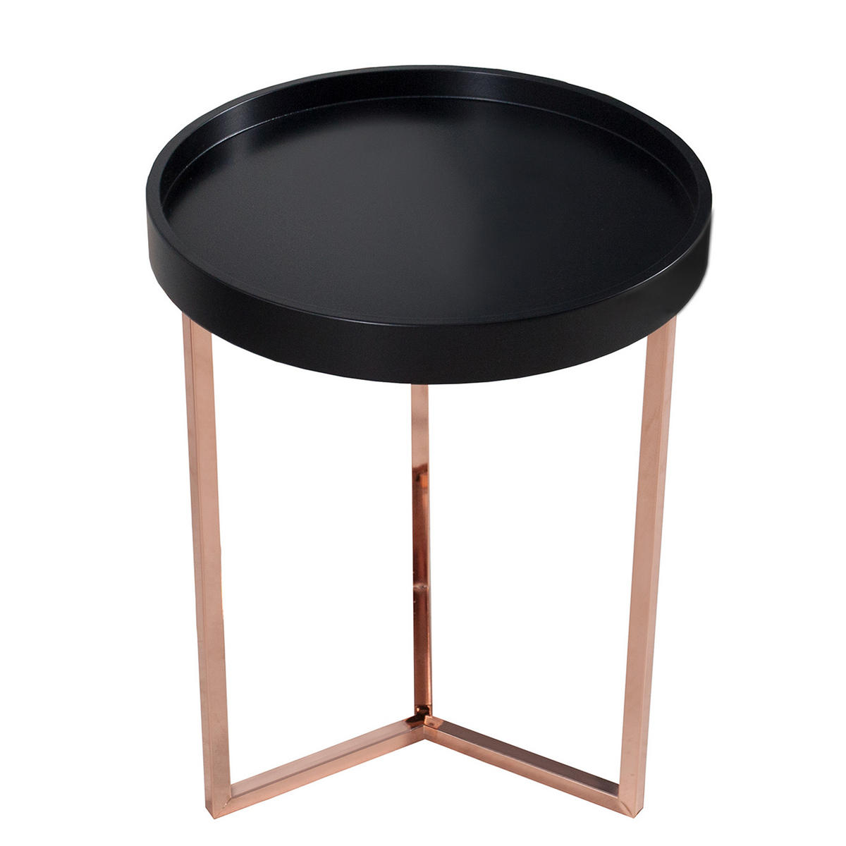 Lifestyle trifft auf Funktionalität - ein Beistelltisch mit abnehmbarem TablettDu suchst einen Beistelltisch mit Mehrfachfunktion und benötigst häufiger ein Tablett zum Servieren? Dieser kleine Tabletttisch mit einer Größe von 40 Zentimetern Durchmesser ist ein Multitalent. Dekorativ steht er vor dem Sofa oder im Esszimmer, wo er mit seiner matt gehaltenen schwarzen Oberfläche ins Augenmerk gelangt. Der erhöhte Rand erweist sich nicht nur beim Abstellen von Getränken, sondern auch beim Einsatz als Tablett hilfreich. Das dreibeinige Gestell in glänzendem Kupfer kann mit einem Handgriff von der Oberfläche getrennt werden, wodurch aus diesem Beistelltisch ohne großen Aufwand ein handliches Tablett für die Gästebewirtung wird.Elegantes Design in Matt-Schwarz und KupferMit diesem Beistelltisch inklusive Tablett erzeugst Du Harmonie in allen Wohnstilen, da er durch sein zeitloses und beinahe minimalistisches Design in jedem Raum zum Star wird. Die glänzenden Tischbeine in gerader Form zeigen eine klare Linie auf, die in Präzision mit dem runden Tablett harmoniert und eine Gesamtheit bildet. Das Besondere an dieser Serie ist, dass sie sich in unzähligen Variationen kombinieren lässt. Doch egal ob einzeln oder in einer Gruppe: Der Beistelltisch MODULAR weiß sowohl als Tablett, wie als Kleinmöbel durch Qualität und robuste Eigenschaften zu überzeugen.