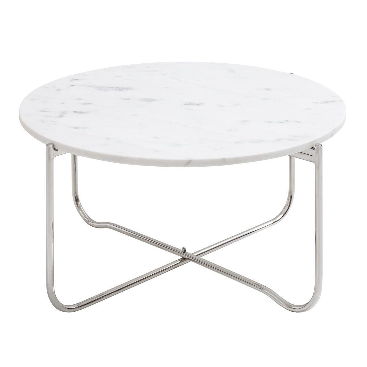 Edelste Materialien in vollkommenem DesignDer absolute Eyecatcher dieses extravaganten Couchtisches ist ohne Frage die runde Tischplatte aus weißem Marmor. Sorgfältig poliert glänzt Marmor wie kein zweites Naturprodukt und gibt den Blick frei auf seine individuelle Maserung, die in Jahrtausend langen, erdgeschichtlichen Vorgängen entstanden ist. Die zahlreichen weißen und hellgrauen Nuancen des Marmors scheinen wie sanfte Wellen miteinander zu verschmelzen und ergeben ein einzigartiges Muster, das jeden Tisch zu einem Unikat werden lässt.Stilvolle Leichtigkeit macht diesen Couchtisch ausGetragen wird die runde Marmorscheibe, die abgenommen auch wunderbar als Tablett genutzt werden kann, von einem filigranen Metallgestell in Silberoptik. Die Verbindung aus der handgearbeiteten Steinplatte und dem zarten Gestell lässt den Tisch trotz seiner imposanten Präsenz nicht wuchtig erscheinen. Jeder Tisch begeistert mit einer ganz individuellen Farbzeichnung und authentischen Gesteinsmerkmalen wie kleinen Unebenheiten oder Einschlüssen - freue Dich auf ein Einzelstück in Deinem Zuhause!
