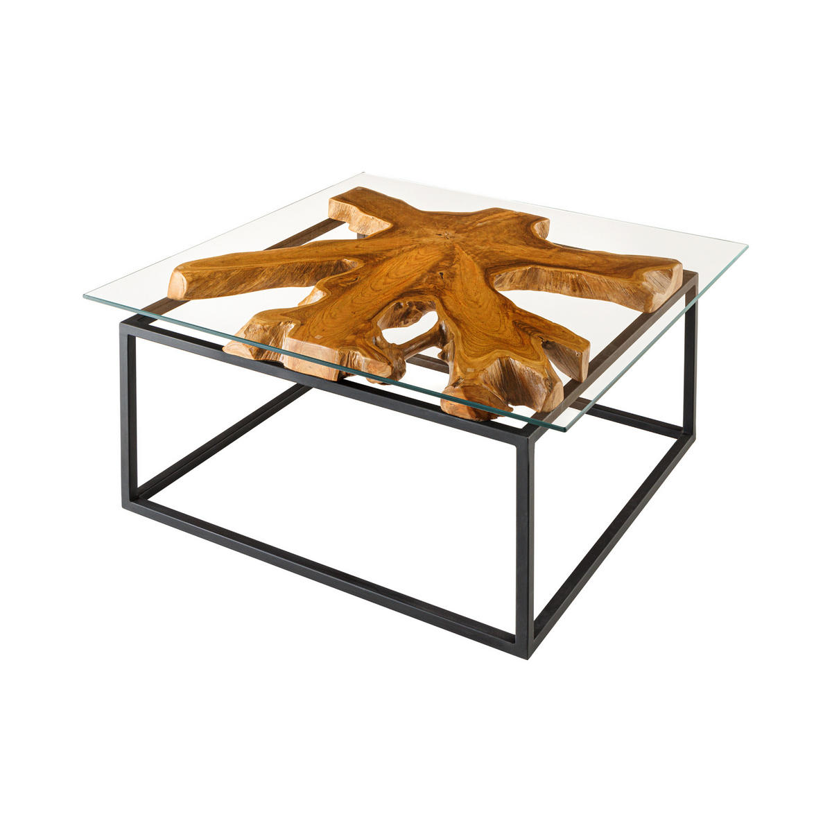 Couchtisch ROOT ? Ein echtes Naturkunstwerk für Dein ZuhauseDu liebst den rauen Industrial-Style, möchtest aber nicht auf natürliche Elemente verzichten? Dann ist der Couchtisch ROOT genau das Richtige für Dich! Hier trifft robustes, schwarzes Metall auf massives Teakholz und schafft eine perfekte Kombination aus urbanem Design und Natur. Die Tischplatte besteht aus einer handgefertigten Wurzelholzstruktur, die nicht nur einzigartig gewachsen ist, sondern auch jeden Tisch zu einem echten Unikat macht. Abgerundet wird das Design durch eine eckige Glasplatte, die das beeindruckende Holz perfekt in Szene setzt und gleichzeitig eine praktische Ablagefläche bietet.Jedes Stück ein echtes UnikatKein Tisch gleicht dem anderen ? das Wurzelholz wächst in faszinierenden, individuellen Formen und macht jedes Exemplar zu etwas ganz Besonderem. Dank der zeitlosen Kombination aus schwarzem Metallgestell, braunem Teakholz und Glas fügt sich der Couchtisch ROOT mühelos in verschiedene Wohnstile ein. Egal, ob zu einem hellen Leinen-Sofa, einer Ledercouch oder einem Massivholz-Regal ? dieser Tisch setzt in jedem Raum ein Statement. Hol Dir ein Stück Natur in Dein Zuhause!Hinweis: Da es sich um ein Naturprodukt handelt, ist jedes Exemplar absolut einzigartig. Unebenheiten, Farbverläufe, charismatische Astlöcher, Risse oder auch Maßdifferenzen sind möglich und erzeugen Ursprünglichkeit und machen den Charme des Massivholzes aus. Dies sind alles keine Reklamationsgründe.