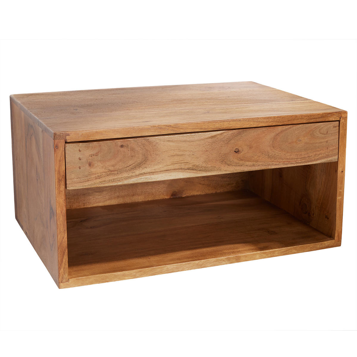 Erlebe den Charme des Massivholz-Nachttisches PURE aus braunem Akazienholz. Mit seiner Maße von 50x25x35cm passt er perfekt in jedes Schlafzimmer. Sein hängendes Design bringt einen modernen Touch und lässt Deinen Raum größer wirken. Die praktische Schublade bietet Dir zusätzlichen Stauraum für Deine Bücher, Brille oder Fernbedienung. Mit dem schwebenden Nachttisch PURE wird Ordnung halten zum Kinderspiel. Verwandle Dein Schlafzimmer zu einem Ort der Erholung und des Stils mit diesem eleganten Möbelstück. Hol Dir jetzt den Massivholz Nachttisch PURE und genieße den Luxus von Qualität & Design in Deinem Zuhause.