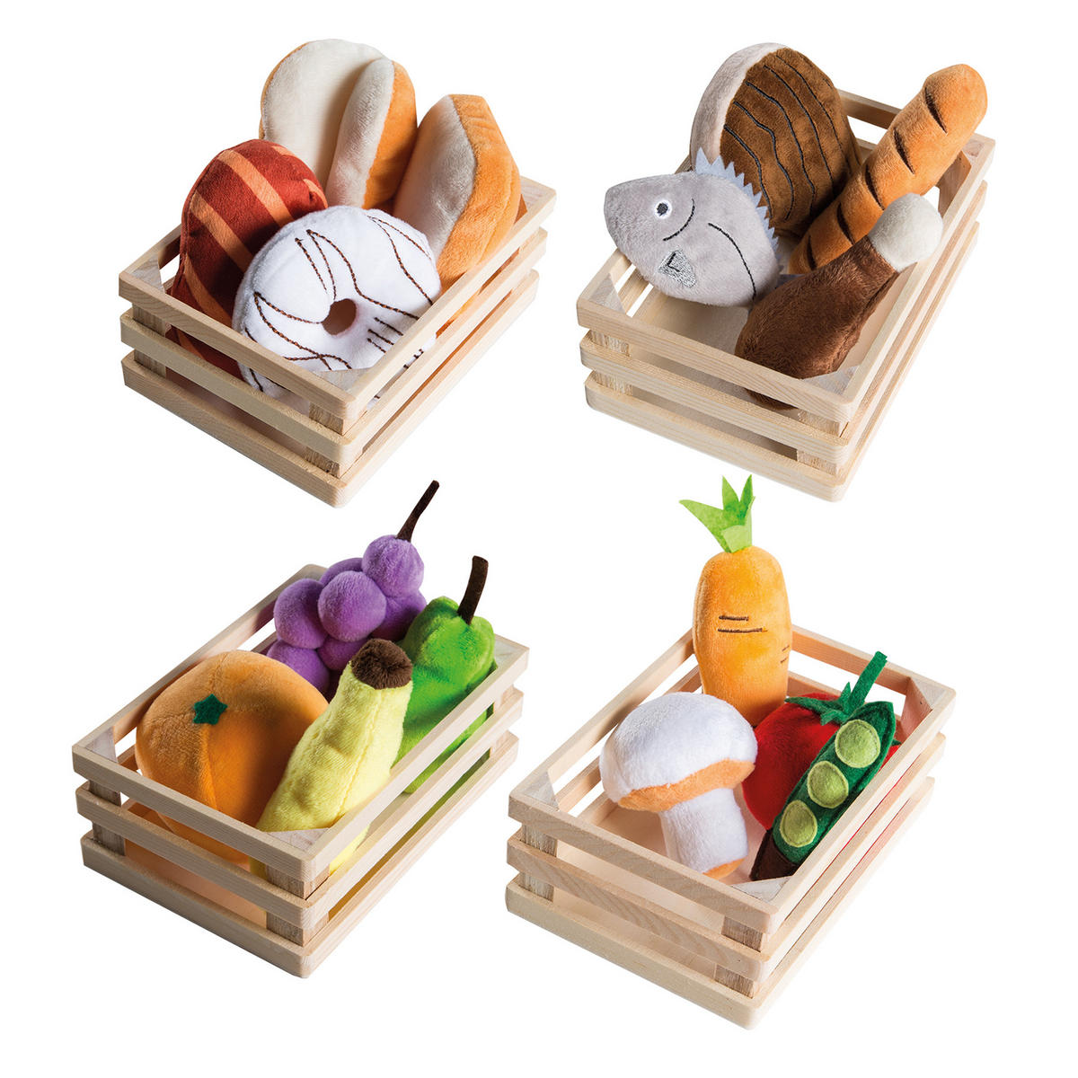 Dieses 20-teilige Kinder-Rollenspiel-Set von roba besteht aus 4 Lebensmittelgruppen und ist eine ideale Ergänzung für jeden Kaufmannsladen und jede Spielküche um spielerisch den Umgang mit Lebensmitteln zu erlernen. Die 4 Körbe aus Holz beinhalten aus hochwertigem Coral Fleece gefertigte Miniatur-Lebensmittel in 4 verschiedenen Nahrungsmittelgruppen: Korb Obst: Banane, Traube rot, Birne und Orange, Korb Gemüse: Erbse, Champignon, Tomate und Möhre, Korb Bäcker: Toast, Brötchen, Donut und weiches Brot, Korb Eiweiß: Steak, Würstchen, Hähnchenbein und Fisch. Das besonders weiche Haushaltsspielzeug-Set bietet ein pädagogisches und realistisches Spielerlebnis für vielfältige Rollenspiele und ist als Kleinkindspielzeug für Kinder ab 3 Jahren geeignet. Dieses Zubehör-Set für Kaufladen und Kinderküche wurde nach der europäischen Sicherheitsnorm für Spielzeug EN 71 in Deutschland entwickelt. Alle verwendeten Materialien sind schadstoffgeprüft und zertifiziert, sowie speichelfest und hautverträglich.