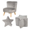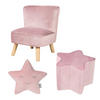 Das roba Bundle „Lil Sofa” besteht aus Kindersessel, Kinderhocker und Dekokissen in Sternform in der Farbe rosa/mauve. Der roba Kindersessel und Kinderhocker in Sternform sind im trendigen Retro-Look gestaltet und mit Samtstoff bezogen, welcher mit seiner pfirsichweichen Oberfläche beeindruckt. Der Kindersessel steht auf stabilen Holzfüßen. Dank der kindgerechten Sitzhöhe sind die Garnituren bereits für die Kleinsten äußerst bequem. Kindersessel: Sitzhöhe 27 cm. HxBxT: 50x44x48 cm. Farbe: rosa/mauve. Kinderhocker: Sitzhöhe 24 cm. HxBxT: 24x32x30 cm. Farbe: rosa/mauve. Die Möbelstücke sind für Jungen und Mädchen ab 18 Monaten geeignet. Passend zu den roba Minimöbeln gibt es weitere Kinder-Sitzmöbel aus der Serie „Lil Sofa“ wie ein Hocker in Herzform und ein ovaler Hocker mit Deckel und Aufbewahrungsfunktion. Die roba Sitzmöbel-Serie „Lil Sofa“ entspricht den aktuellen Sicherheitsstandards. Das roba Kuschelkissen „roba Style“ Stern in der Farbe rosa/mauve ist herrlich weich und ist für Kinder viel mehr als „nur“ ein Dekokissen. Mit seinem niedlichen, aufgestickten Gesicht wird das Sternkissen schnell zum Freund, Beschützer, Spielgefährten, Trostspender oder dient als Einschlafhilfe. Kleinkinder bauen häufig eine enge Bindung zu einem Kuscheltier auf und nehmen es gerne überall hin mit. Das Kuschelkissen vermittelt Ihrem Kind, genau wie ein Kuscheltier, ein Gefühl von Vertrautheit und vermittelt dadurch Kraft und Mut. Unterwegs eignet es sich als weiche Unterlage für den Kopf. Als Dekokissen macht es eine gute Figur im Kinderbettchen oder auf dem Sofa und passt zu jeder Einrichtung im Kinder- und Babyzimmer. Die Kuschelkissen aus der Serie „roba Style“ sind als Wolke, Stern oder Mond in den drei Farben Rosa/Mauve, Hellblau/Sky oder Silbergrau erhältlich. Alle verwendeten Materialien sind schadstoffgeprüft und zertifiziert. Maße: (HxBxT): 28x32x8 cm. Für Kinder ab 0 Jahren.
