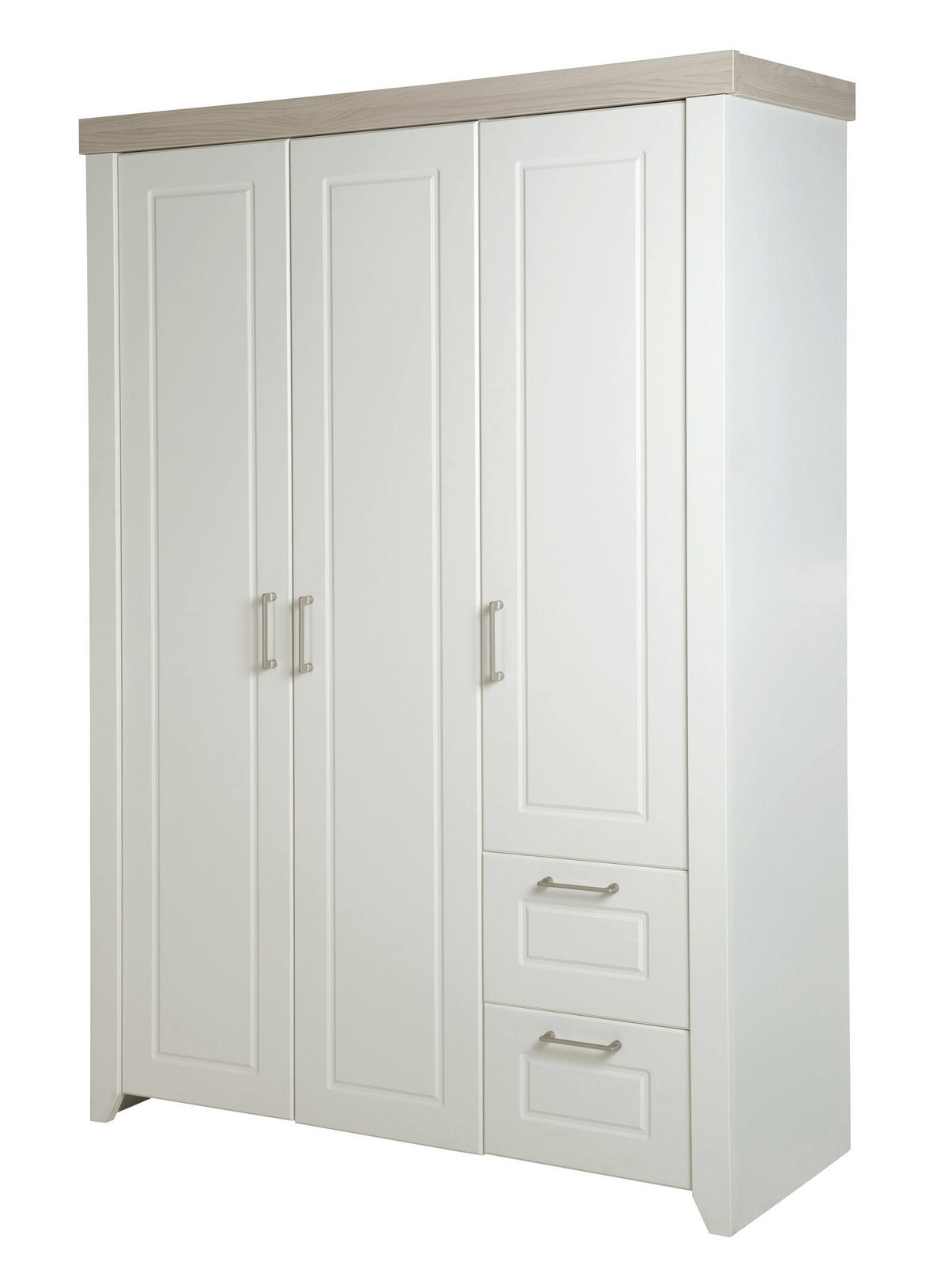 - Materialzusammensetzung: Korpus: Spanplatte (melaminbesch.), Fronten: beschichtetes MDF (mit Zierfräsung), Rückwand: HDF, Böden: Spanplatte (melaminbesch.), Griffe: Metall, Kleiderstange: Metall