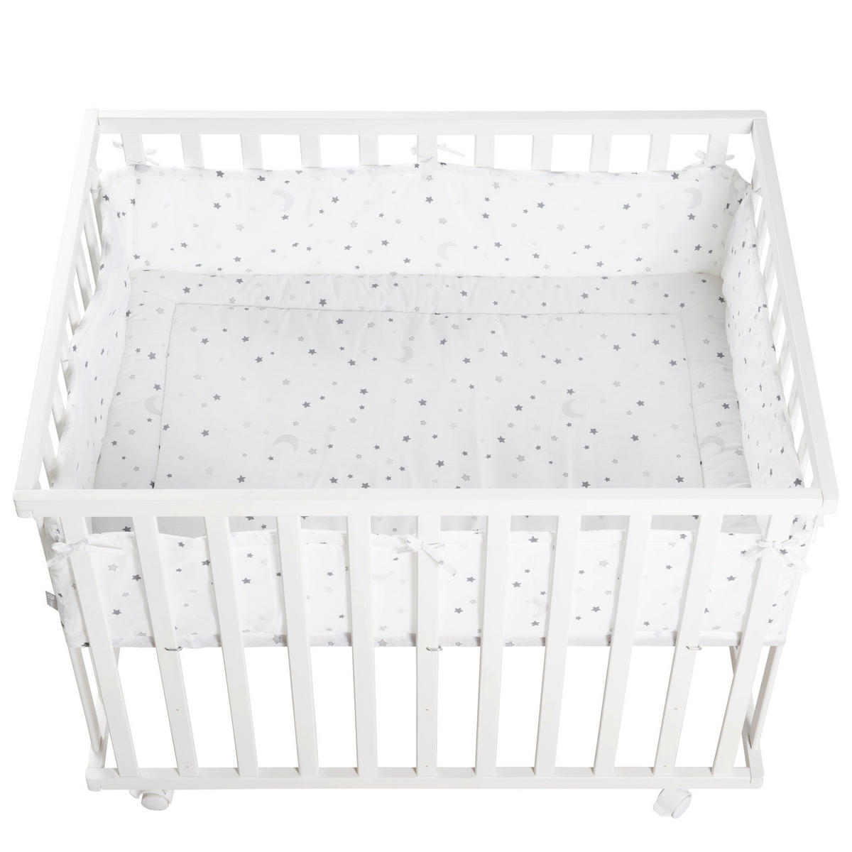 - Besonderheiten: Laufgitter 75 x 100 cm ‚Sternenzauber grau‘ - in weiß lackiert - 3-fach höhenverstellbar - inkl. gepolstertem, abwaschbarem Boden - mit 4 Bremsrollen