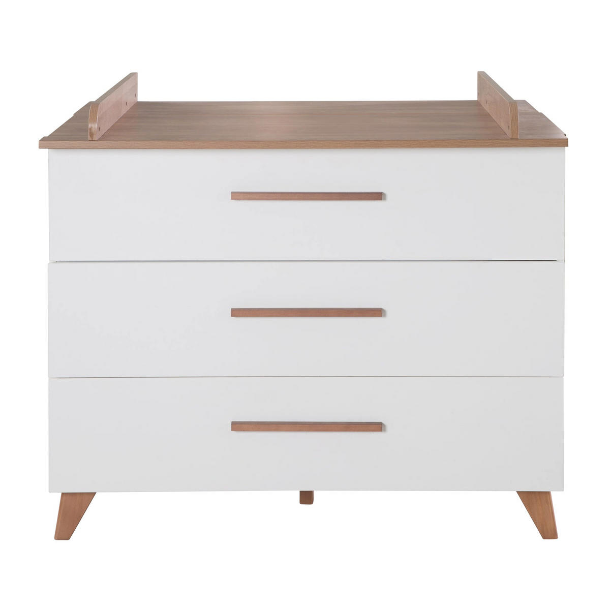 - Besonderheiten: Wickelkommode- inkl. abnehmbarem Wickelaufsatz - mit 3 Schubladen - Füße und Griffe aus Massivholz - in Holz weiß / Dekor dunkle Eiche