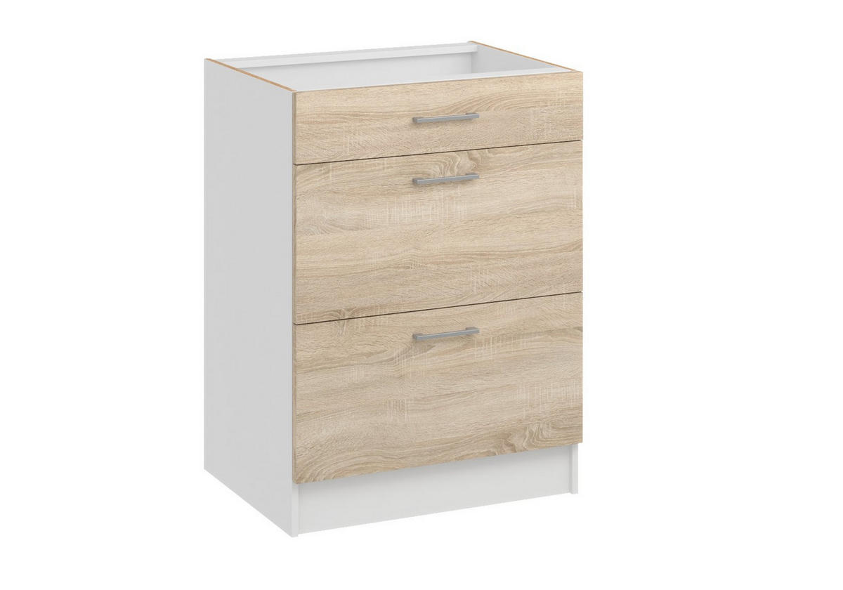 Material: Hochwertige laminierte PlatteFarbe: Erhältlich in einer Vielzahl von Farben, die zu Ihrer Küche passenKonstruktion: Robust und langlebig für eine dauerhafte NutzungFunktionsweise:Schubladen: 3 geräumige Schubladen für Küchenutensilien, Besteck oder kleine AccessoiresScharniere: Hochwertige Scharniere, die ein leichtgängiges Öffnen und Schließen der Türen gewährleistenWarum sollten Sie diesen Schrank wählen?Optimale Abmessungen: Ideale Proportionen für kleine und mittelgroße Küchen, die maximale Funktionalität bei minimalem Platzbedarf gewährleisten