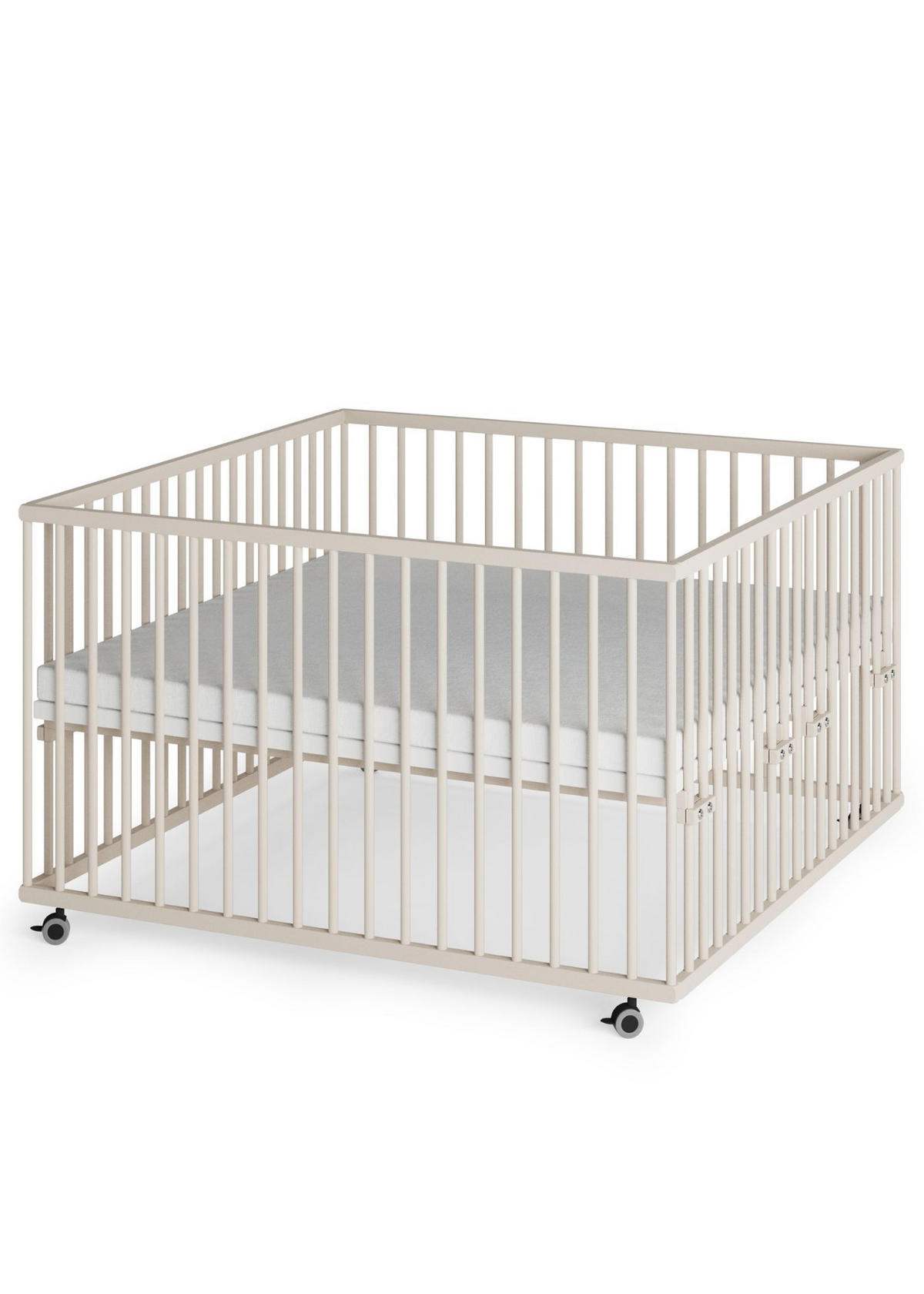 LAUFGITTER XXL 120x120 cm mit Matratze, Lattenrost & Schlupfsprossen - sahara dust - Premium Kollektion - Sandfarben, Holz (120/74/120cm) - Sämann – make a difference.