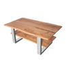 Moderner Couchtisch Patrick mit Ablage und Glaseinlage, 115 x 65 cm, Akazienholz massiv + naturfarben, silber lackiertes U-Metallgestell, echte Baumkante