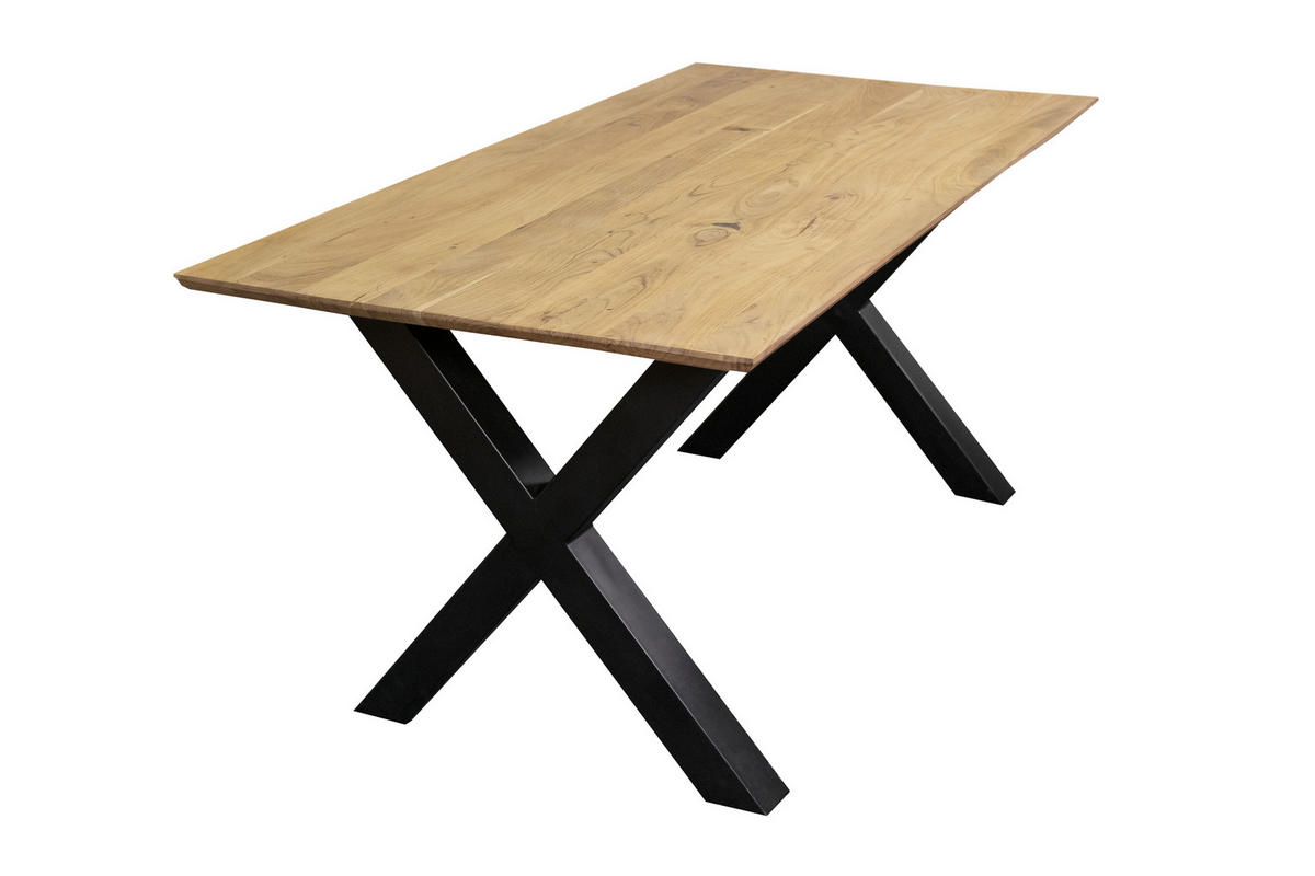 Trendiger Esstisch Andi, 200 x 100 cm, 26 mm Tischplatte, Akazienholz massiv + naturfarben, X-Gestell Schwarz