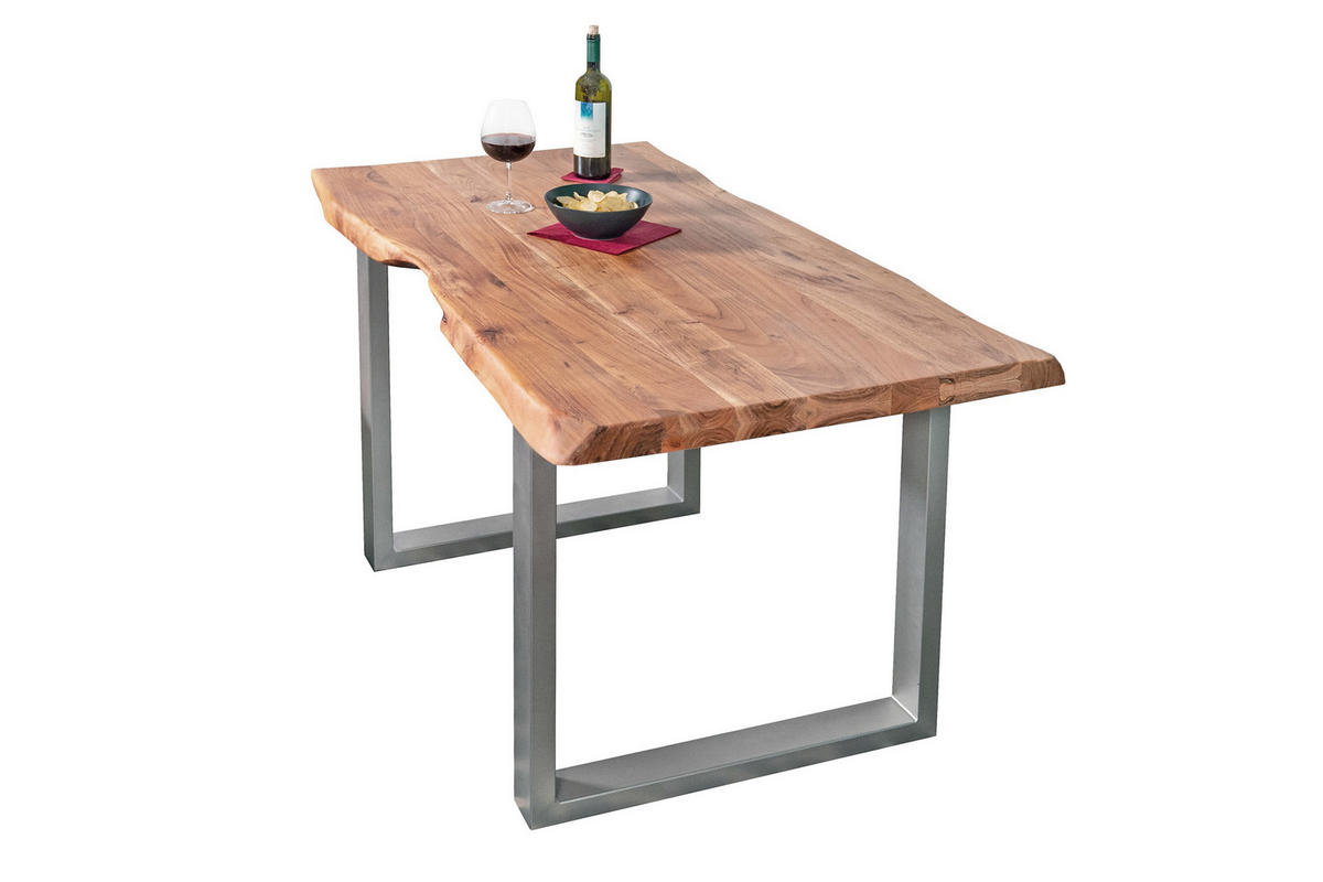 Trendiger Esszimmertisch Cali, 160 x 85 cm, Akazienholz massiv & naturfarben, Tischplatte (25 + 25 mm), U-Gestell Silber