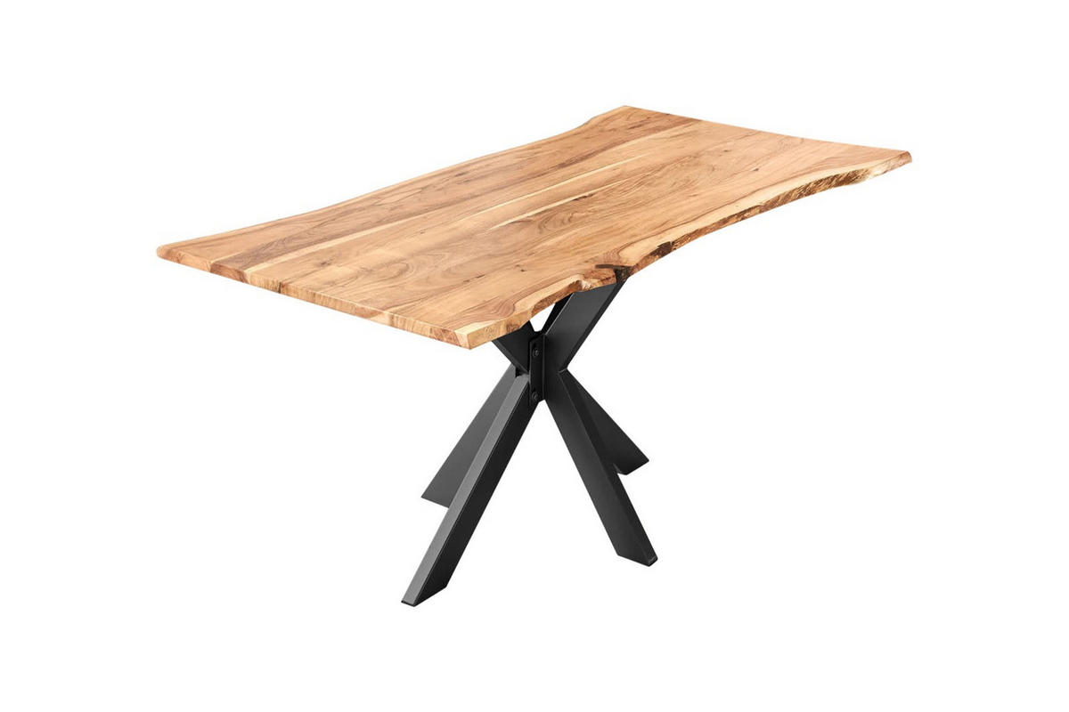 Trendiger Esszimmertisch Helene mit mattschwarzem Spider-Gestell aus Roheisen, 220 x 100 cm, Akazienholz naturfarben, echte Baumkante, Tischplatte 26 mm