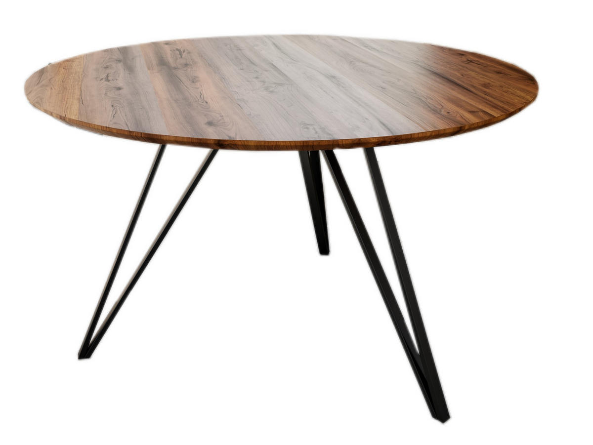 Runder Esszimmertisch Insa 120 cm mit 26 mm Tischplatte in Ausführung Schweizer Kante, Akazienholz massiv & nussbaumfarben, Metallgestell Schwarz