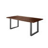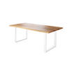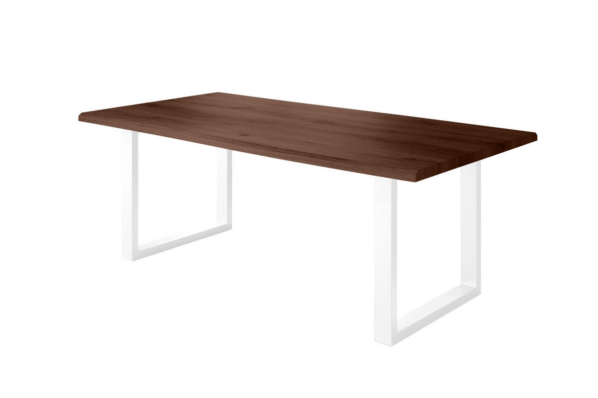 Esstisch Julius, 240 x 100 cm, Holz-Optik Nussbaum, U-Gestell Weiß, 40 mm Tischplatte mit BaumkanteUnser Esstisch Julius – Natürliches Wohngefühl trifft modernes DesignWillkommen an Ihrem neuen Lieblingsplatz! Der Esstisch Julius vereint den warmen Charme natürlicher Holzoptik mit der klaren Linie eines modernen Metallgestells. Seine wilde, gefräste Baumkante bringt einen Hauch Ursprünglichkeit in dein Esszimmer und sorgt für ein wohnliches Ambiente voller Stil und Leichtigkeit. Ob zum ausgiebigen Frühstück oder beim gemütlichen Dinner mit Ihren Liebsten – Julius schenkt jedem Moment eine besondere Note.ProduktbeschreibungGefräste Baumkante – Natur in klarer Form:Die wunderschöne Tischplatte in Nussbaum-Optik begeistert mit einer gefrästen Baumkante, die den Esstisch lebendig wirken lässt – wie von der Natur inspiriert, sanft geformt und stilvoll vollendet. Jeder Blick auf diese Kante ist eine kleine Flucht aus dem Alltag, hinein in Ihr persönliches Wohlfühlreich.Nussbaum-Dekor auf MDF – Schön, pflegeleicht & formstabil:Die 40 mm starke Tischplatte überzeugt durch ihre hochwertige Verarbeitung. Das Nussbaum-Dekor bringt Wärme und Geborgenheit in dein Zuhause, während der MDF-Kern für Leichtigkeit und Alltagstauglichkeit sorgt. Temperatur- und feuchtigkeitsunempfindlich bleibt Julius auch bei täglichem Gebrauch formschön und zuverlässig.Modernes Metallgestell – Stabilität mit Stil:Das U-Gestell aus weiß lackiertem Metall steht für klare Linien und eine stabile Basis. Es bildet einen reizvollen Kontrast zur natürlichen Holzoptik und verleiht dem Tisch seine moderne, ruhige Ausstrahlung. Die intelligente Konstruktion mit wählbarem Fußabstand sorgt für individuelle Flexibilität – so passen deine Stühle immer perfekt.Vielseitig & mühelos kombinierbar:Esstisch Julius passt wunderbar in verschiedene Wohnräume und ist ideal als Ess- oder Küchentisch. Seine zeitlose Optik lässt sich harmonisch mit