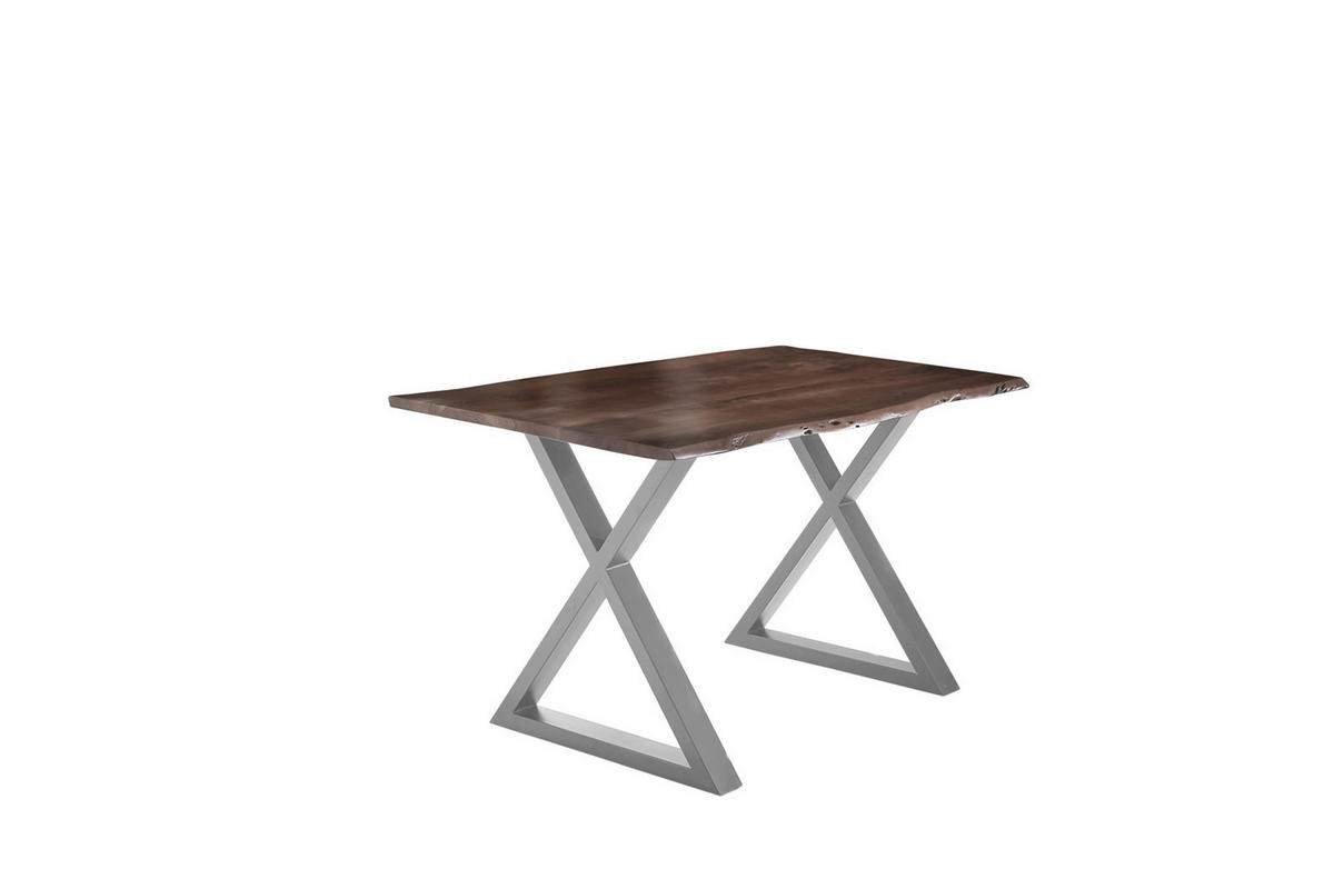 Stilvoller Baumkantentisch Lubin, Akazienholz massiv + nussbaumfarben, 160x85 cm, echte Baumkante, X-Gestell aus silber lackiertem Metall