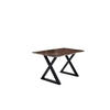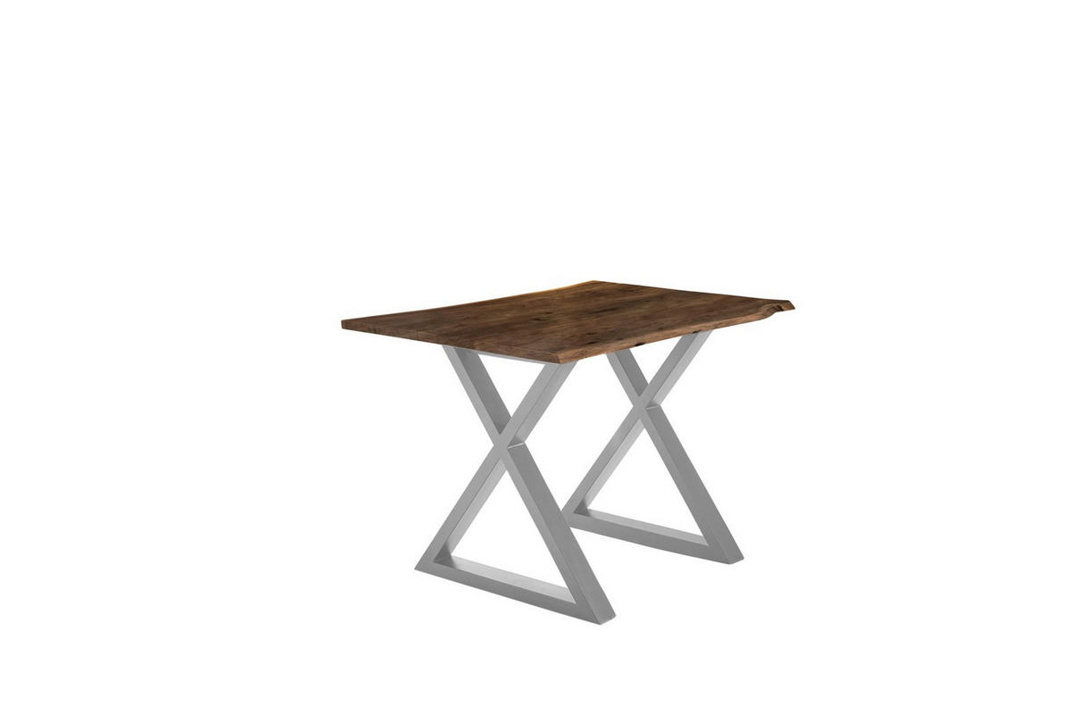 Stilvoller Baumkantentisch Lubin, Akazienholz massiv + nussbaumfarben, 120x80 cm, echte Baumkante, X-Gestell aus silber lackiertem Metall