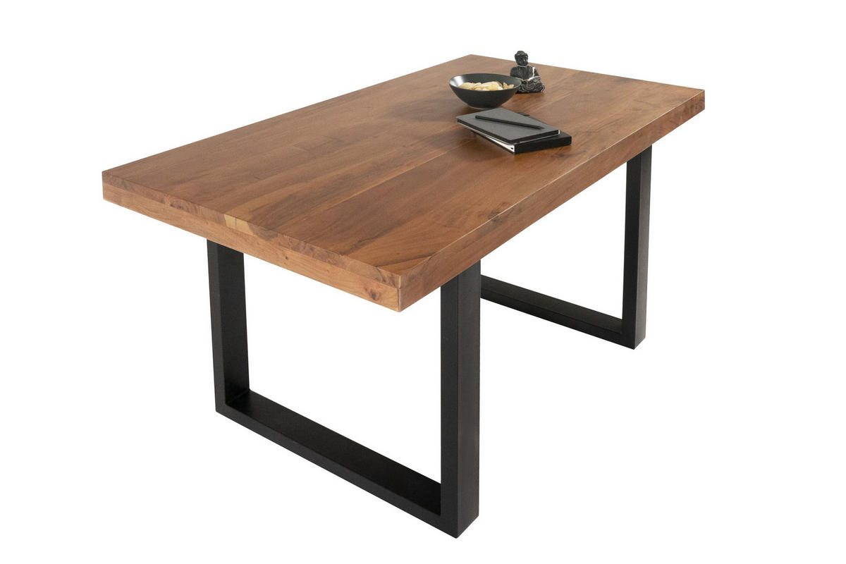 Hochwertiges Unikat – Der Esstisch besteht aus massiven und robusten Akazienholz. Aufgrund der einzigartigen Maserung erhalten Sie ein Unikat mit individuellem Charakter. Das U-förmige Gestell sorgt für einen gelungenen Kontrast, welcher dem Massivholztisch einen Hauch von industriellem Look verleiht. Kleine herausdrehbare Kunststofffüßchen an den Tischbeinen schützen den Boden vor Kratzern.