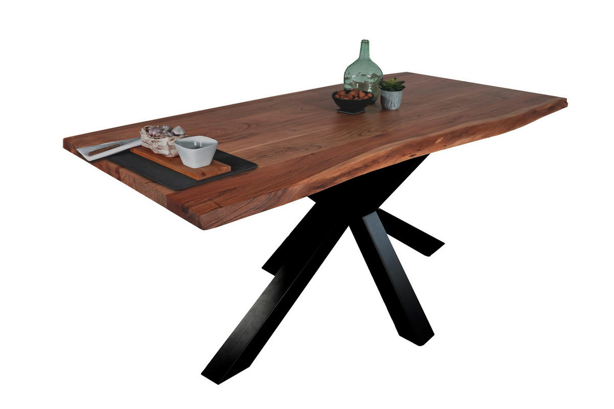 Moderner Esszimmertisch Tim, 180 x 90 cm, Akazienholz massiv & nussbaumfarben, Tischplatte (25 + 25 mm), Spider-Gestell SchwarzHochwertiges Unikat – Der Esstisch besteht aus massiven und robusten Akazienholz. Aufgrund der einzigartigen Maserung erhalten Sie ein Unikat mit individuellem Charakter. Zusätzlich sorgt das Spider-förmige Gestell für einen gelungenen Kontrast, der dem Massivholztisch einen Hauch von industriellem Look verleiht.Lackiert & geschützt – Die Tischoberfläche wurde sorgfältig mit einem hochwertigen Klarlack behandelt, um das Holz vor Feuchtigkeit, Kratzern und alltäglicher Beanspruchung zu schützen, ohne dabei den natürlichen Charakter und die warme Ausstrahlung des Holzes zu verlieren.Aufgedoppelte Tischplatte – Die Tischplatte wurde an den Kanten auf 50 mm (25 + 25 mm) aufgedoppelt. Eine aufgedoppelte Platte hat den Vorteil, dass sie wesentlich leichter ist als normale Platten, aber optisch einen massiveren Eindruck hinterlässt.Natur Pur – Besonderes Highlight des Esszimmertisches sind die Tischkanten, die den natürlichen Formen eines Baumes entsprechen und direkt aus dem Baumstamm geschnitten wurden. Da der Tisch ein reines Naturprodukt ist, kann es zu Astlöchern oder unterschiedlichen Farbnuancen kommen.Ausgezeichnete Verarbeitung – Die Möbel aus diesem schönen Massivholz sind sorgfältig hergestellt und umweltfreundlich, wodurch die Möbel atmungsaktiv bleiben und eine gesunde Wohlfühl-Atmosphäre schaffen.Vielseitig einsetzbar – Der rustikale Charme des Küchentischs verleiht Ihrer Essecke eine gemütliche Atmosphäre und macht sie zu einem einladenden Ort. Die trendigen Baumkanten verleihen dem Tisch eine rustikale Note. In Kombination mit stilgerechten Stühlen entsteht eine modische Tischgruppe, die Ihrem Zuhause eine angenehme Ausstrahlung verleiht. Kleine herausdrehbare Kunststofffüßchen an den Tischbeinen schützen den Boden zusätzlich vor