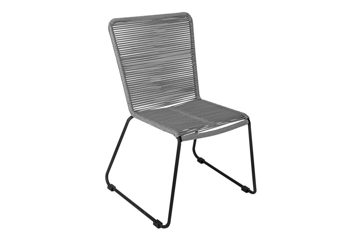 Moderner Outdoor-Stuhl Isra mit Seilbespannung in Grau und schwarzen Eisenfüßen und Eisenrahmen