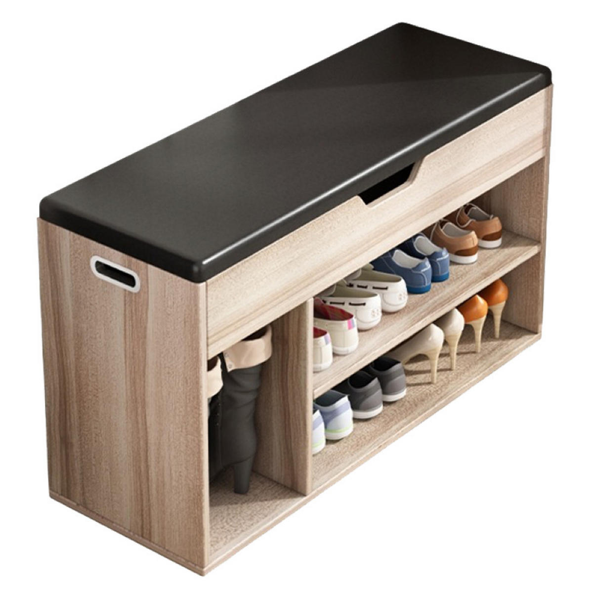 Die hellbraune Farbe verleiht dem Möbelstück eine warme und freundliche Ausstrahlung, während das integrierte Sitzpolster zusätzlichen Komfort bietet. Ideal für alle, die eine praktische und stilvolle Lösung zur Schuhaufbewahrung suchen.