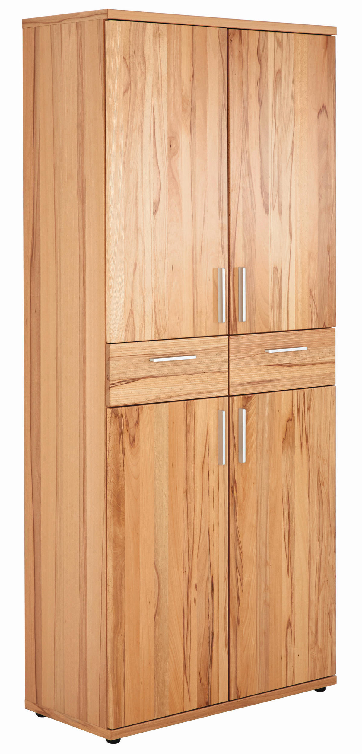 Dieser Schuhschrank mit 2 Schubladen und 4 Türen beeindruckt durch die geradlinige Gestaltung und die Materialkombination. Der Korpus sorgt mit Kernbuche furniert für eine stabile Basis, während die Front aus Echtholz mit einer Reliefhobelung behandelt wurde und so ein optisches Highlight schafft. Die Griffleisten in Chromfarben passen hervorragend zur Struktur des Möbels und vollenden das Gesamtbild elegant.