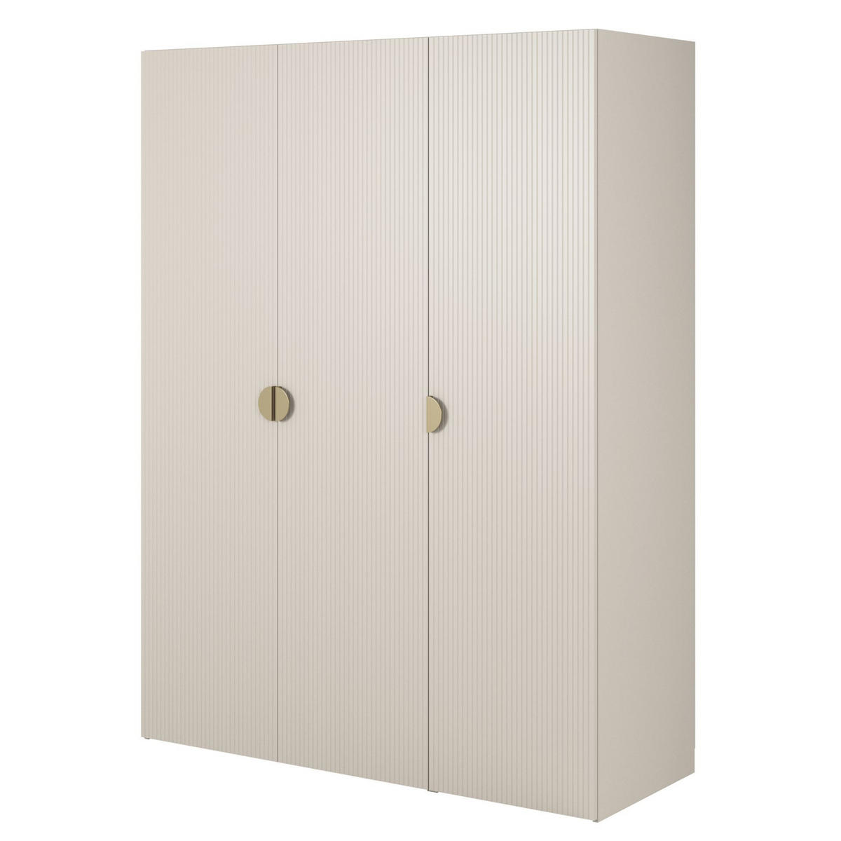 Der Korpus besteht aus hochwertiger laminierter Spanplatte, die nicht nur langlebig, sondern auch besonders pflegeleicht ist. Die Fronten sind mit dezenten Lamellen versehen, die für eine interessante Struktur und einen eleganten Look sorgen. Ein goldener Halbrundgriff aus gebürstetem Stahl setzt einen stilvollen Akzent und bildet einen ansprechenden Kontrast zur matten Oberfläche des Korpus.