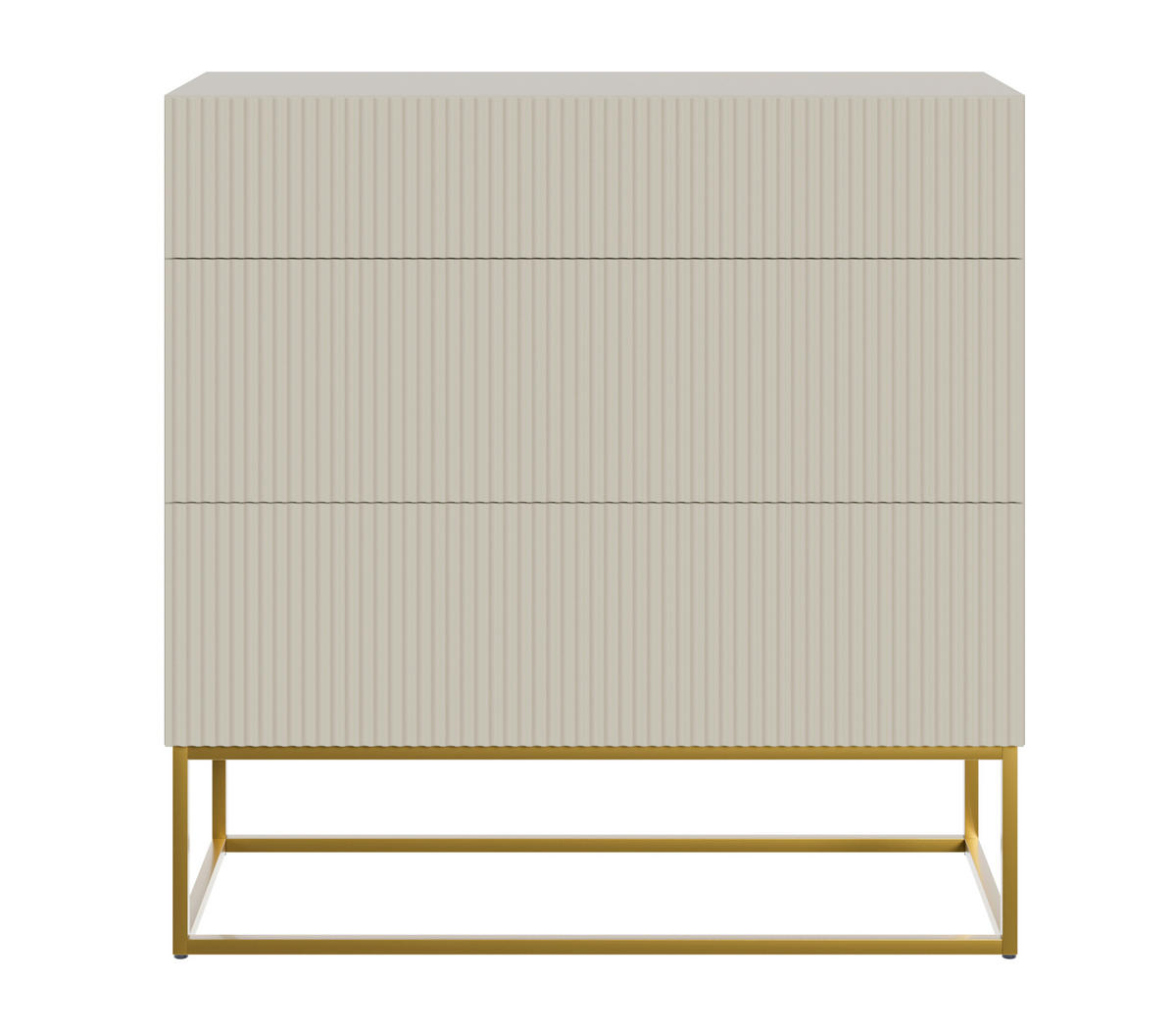 Die Kommode Veldio mit 3 Schubladen ist ein praktisches und stilvolles Möbelstück, das sich ideal für den Wohn- oder Schlafzimmerbereich, fürs Home-Office oder für den Flur eignet. Die Kommode ist in einem schlichten und eleganten Design gehalten. Die geriffelten Fronten verleihen ihr einen modernen Look und können dazu beitragen, einen Raum größer und heller wirken zu lassen. Die Schubladen sind mit Push-Open-System ausgestattet, das ein leises und sanftes Schließen ermöglicht. Veldio ist aus hochwertigen Materialien gefertigt und bietet viel Stauraum. Drei Schubladen lassen Sie Ihre Sachen organisiert aufbewahren, und zwar blickdicht und staubsicher. Dank der komfortablen Höhe von 90 cm ist die 38 x 90 cm große Oberplatte als zusätzliche Abstellfläche zu nutzen. Legen Sie hier Accessoires ab, die Sie stets griffbereit haben möchten, oder nutzen Sie diese Fläche für Ihre schönen Dekoartikel.