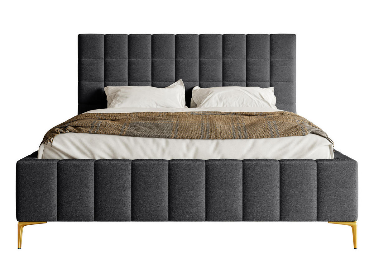 Mit dem Polsterbett Szejlo holen Sie sich Luxus und Eleganz in Ihr Schlafzimmer. Das ganze 126 cm hohe Kopfteil, weich gepolstert und mit geometrischem Steppmuster versehen, macht das Bett zum Hingucker und ermöglicht bequemes Zurücklehnen beim Lesen oder Frühstücken. Die schönen Metallbeine in Gold versprühen eine angenehme Leichtigkeit und verleihen dem Doppelbett einen recht luxuriösen Charakter.