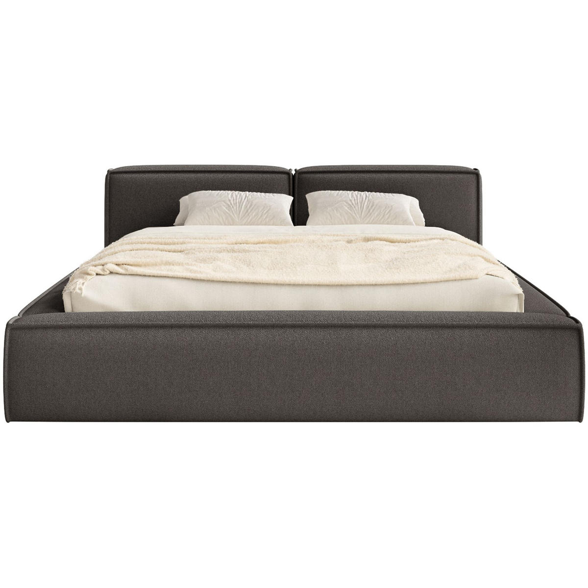 Das niedrige, glatte Kopfteil sorgt für ein offenes Raumgefühl und verleiht dem Design eine elegante Balance. Es ist weich gepolstert und bietet angenehmen Komfort, ohne den Raum optisch zu dominieren.