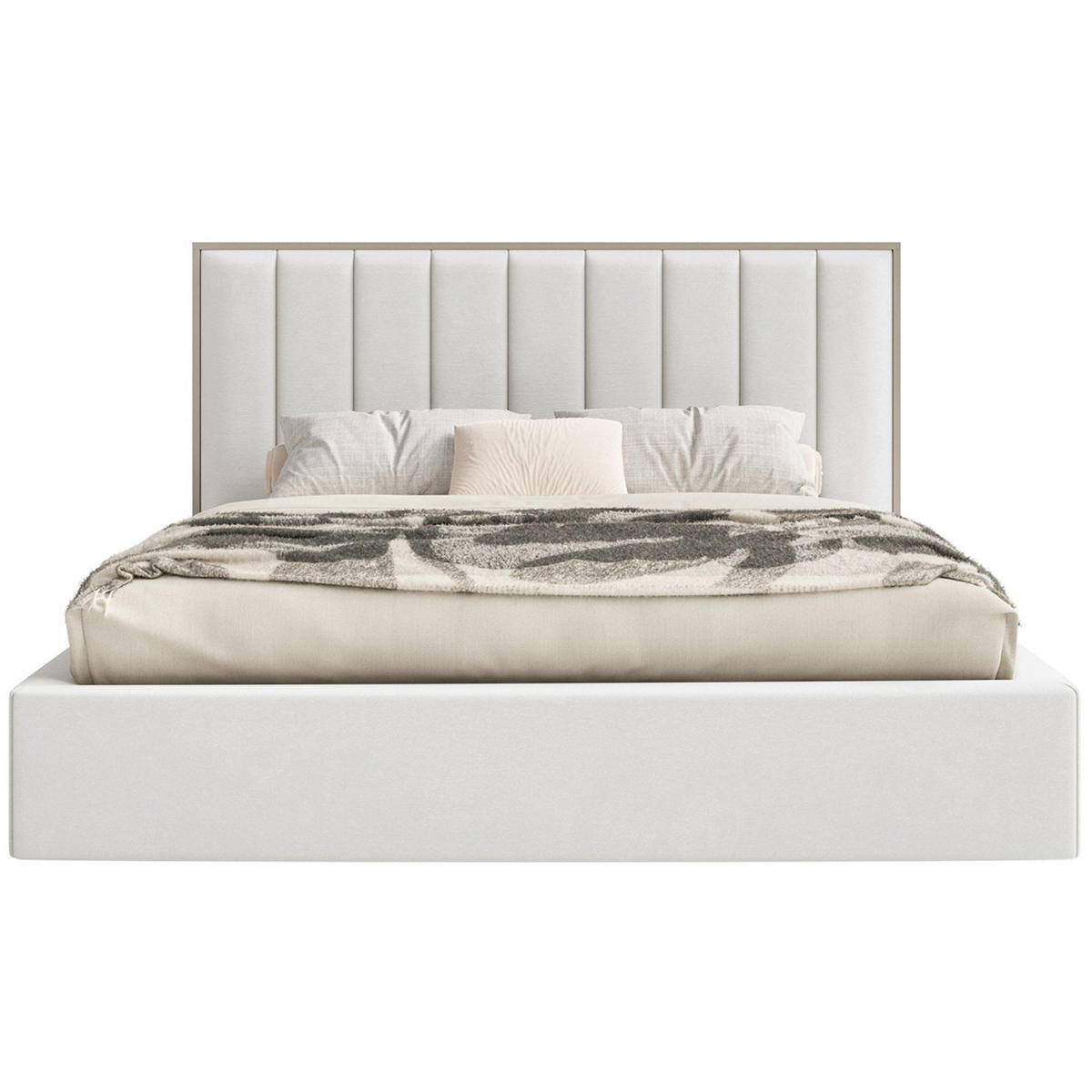 Ein besonderes Detail ist der schmale Rahmen in warmem Kaschmirgrau, der das Kopfteil elegant einfasst und die vertikale Struktur stilvoll betont. Die Kombination aus Polsterung und dekorativer Umrahmung verleiht dem Bett Tiefe und modernen Charakter.
