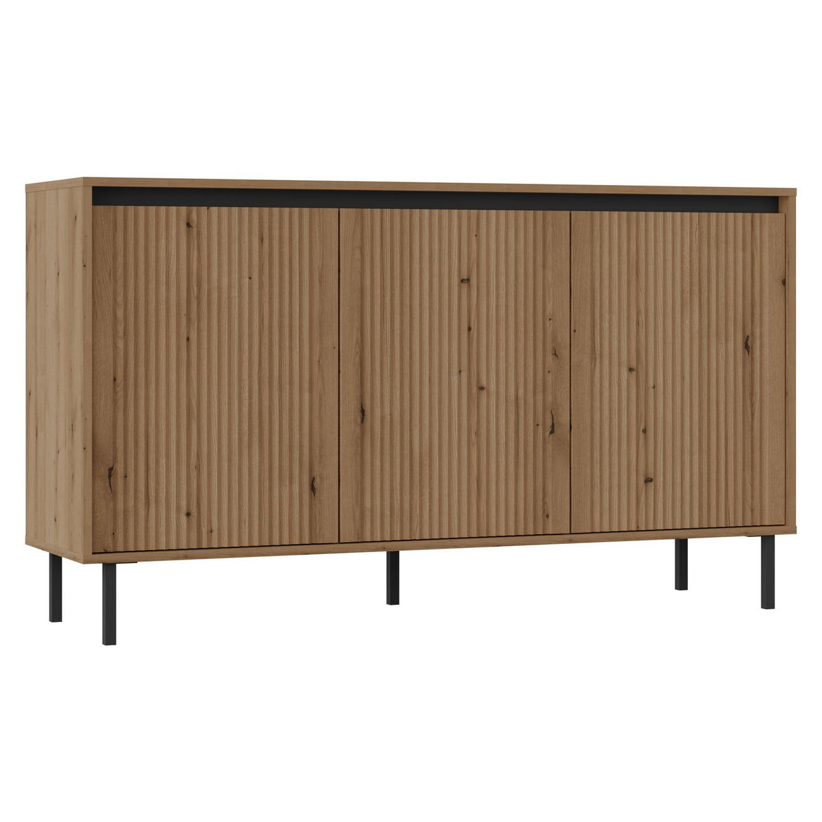 Das Sideboard Osaka überzeugt durch seine durchdachte Aufteilung: Drei Türen verbergen insgesamt sechs geräumige Fächer, die für eine übersichtliche und ordentliche Aufbewahrung sorgen. Die großzügige Ablagefläche auf der Oberseite des Sideboards bietet zusätzlichen Platz, um Dekoration, Bilderrahmen oder andere Gegenstände stilvoll zu präsentieren.