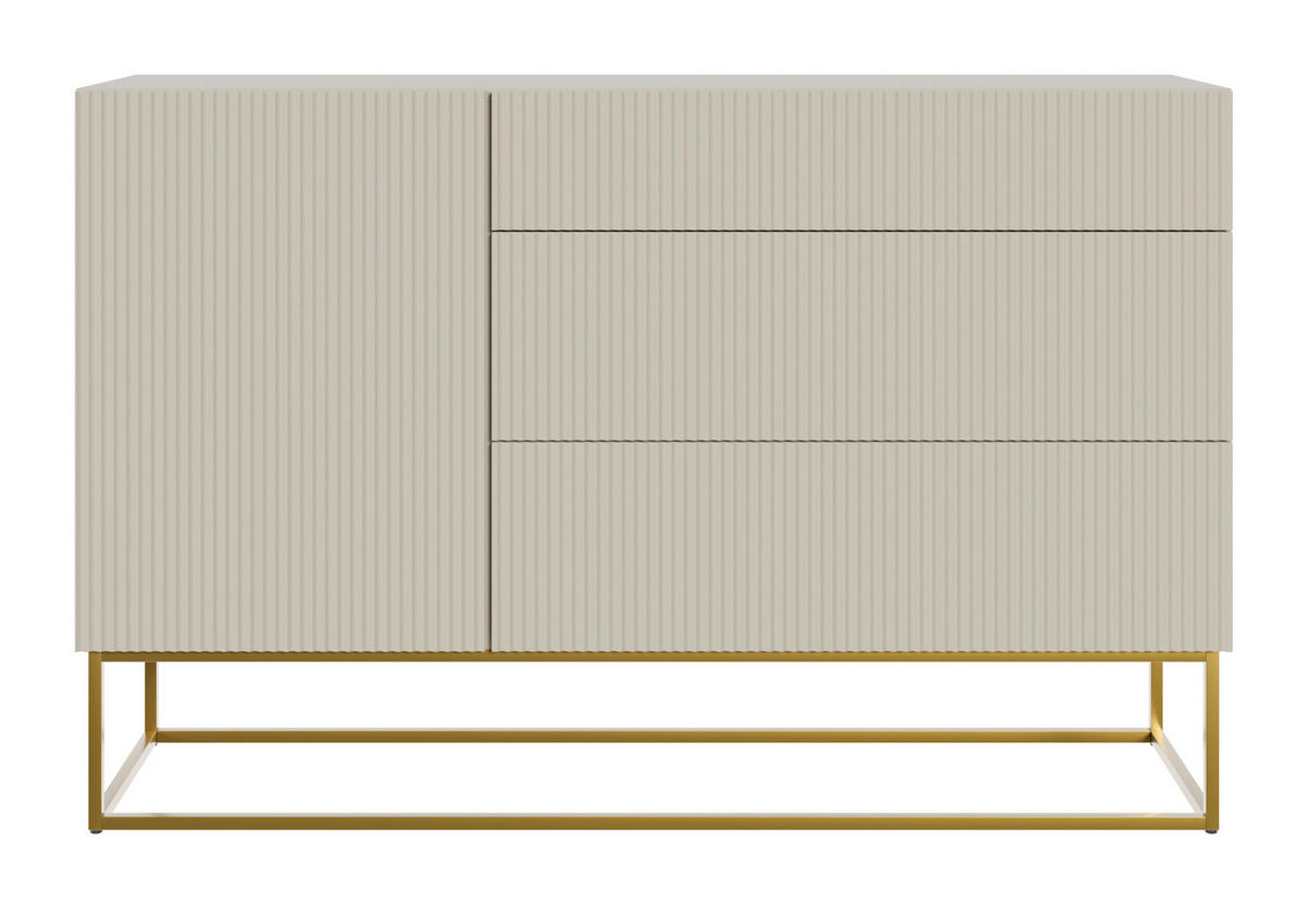 Die Kommode Veldio mit 3 Schubladen und einer Tür ist ein praktisches und stilvolles Möbelstück, das sich ideal für den Wohn- oder Schlafzimmerbereich, fürs Home-Office oder für den Flur eignet. Die Kommode ist in einem schlichten und eleganten Design gehalten. Die geriffelten Fronten verleihen ihr einen modernen Look und können dazu beitragen, einen Raum größer und heller wirken zu lassen. Die Schubladen sind mit Push-Open-System ausgestattet, das ein leises und sanftes Schließen ermöglicht. Veldio ist aus hochwertigen Materialien gefertigt und bietet viel Stauraum. Drei Schubladen lassen Sie Ihre Sachen organisiert aufbewahren, und zwar blickdicht und staubsicher. Hinter der Tür befinden sich zwei geräumige Fächer, die sich ideal für die Aufbewahrung von Büchern, Kleidung, Dekorationsartikeln oder anderen Dingen eignen. Dank der komfortablen Höhe von 90 cm ist die 38 x 140 cm große Oberplatte als zusätzliche Abstellfläche zu nutzen. Legen Sie hier Accessoires ab, die Sie stets griffbereit haben möchten, oder nutzen Sie diese Fläche für Ihre schönen Dekoartikel.