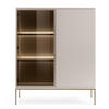 Der Korpus besteht aus langlebiger, laminierter Holzplatte, während die Fronten aus dekorativ gefrästem MDF gefertigt sind. Die feinen Linien verleihen der Vitrine eine moderne Leichtigkeit. Besonders raffiniert: Eine der Türen ist verglast und erlaubt einen stilvollen Blick auf Ihre schönsten Deko-Elemente, Sammlerstücke oder Bücher. Alternativ lässt sich die Tür auch schließen, um ein ruhiges, aufgeräumtes Gesamtbild zu schaffen.