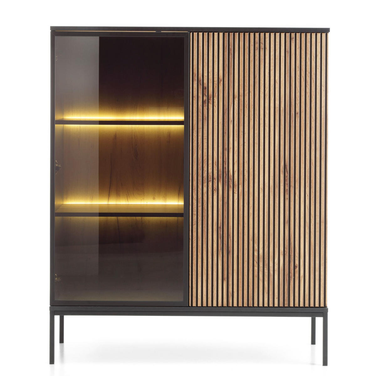 Im Inneren sorgt eine integrierte LED-Beleuchtung für stimmungsvolle Lichtakzente – perfekt, um Ihre Lieblingsstücke auch abends ins rechte Licht zu rücken. Die Beleuchtung bringt nicht nur Atmosphäre in den Raum, sondern unterstreicht auch das hochwertige Design der Vitrine.