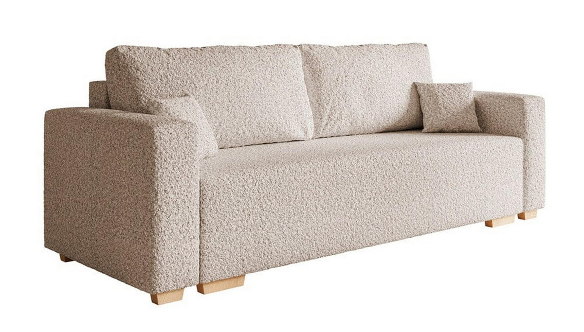 Das Sofa verfügt über eine Schlaffunktion mit einem einfach zu bedienenden DL-System, das eine schnelle Umwandlung in ein bequemes Bett mit großer Schlaffläche ermöglicht, sowie über einen geräumigen Bettkasten für Bettwäsche, der notwendige Gegenstände aufnehmen kann. Das Möbelstück wurde aus hochwertigen Materialien gefertigt, was Komfort und Bequemlichkeit bei der Nutzung sowie Robustheit und Langlebigkeit über Jahre garantiert. Das Sofa ist mit dem Stoff Abriamo bezogen, einem weichen, zarten Stoff, der abriebfest ist. Es zeichnet sich durch gedrehte Schlaufen aus, die an ein Schäfchen erinnern.