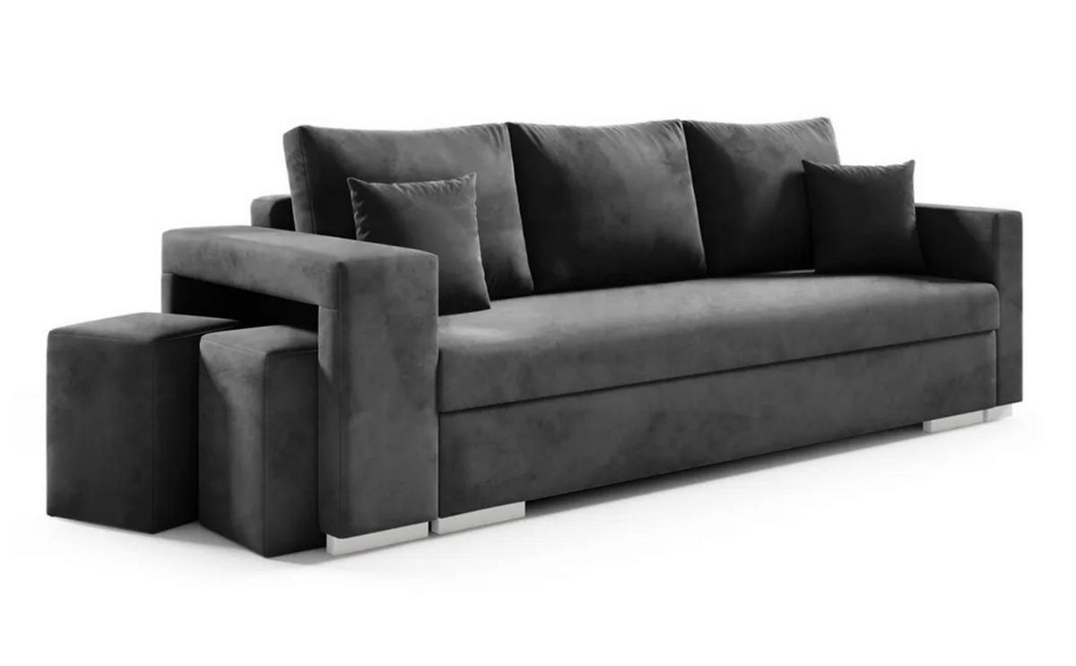 Sofa Tango ist ein elegantes und sehr bequemes Sofa, das das Interieur jedes Wohnzimmers ergänzt. Das Sitz- und Rückenpolster des Sofas besteht aus Schaumstoff und Bonell-Federn, die das Möbelstück flexibler, komfortabler und langlebiger machen. Zusätzlich verfügt das Sofa über einen DL-Automatikmechanismus, der das Ausklappen des Möbels erleichtert. Ein weiterer Vorteil sind die zwei Hocker im Set, die in einer speziellen Nische unter der Armlehne aufbewahrt und bei Bedarf herausgenommen werden können, ohne dabei zu viel Platz einzunehmen. Die großen Kissen haben abnehmbare Bezüge, was die Reinigung des Sofas erleichtert.