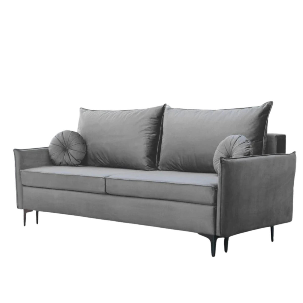 Das Sofa mit modernem Aussehen wird in jedem Wohnzimmer oder Zimmer ideal zur Geltung kommen. Das Sofa beeindruckt durch sein Aussehen und Stil. Die Verwendung von dünnen Armlehnen und hohen verchromten Füßen lässt das Möbelstück leicht wirken. Zum Sofa gehören zwei kleine runde Dekokissen. Das Möbel wurde aus hochwertigen Materialien gefertigt, wodurch es viele Jahre lang dienen wird.