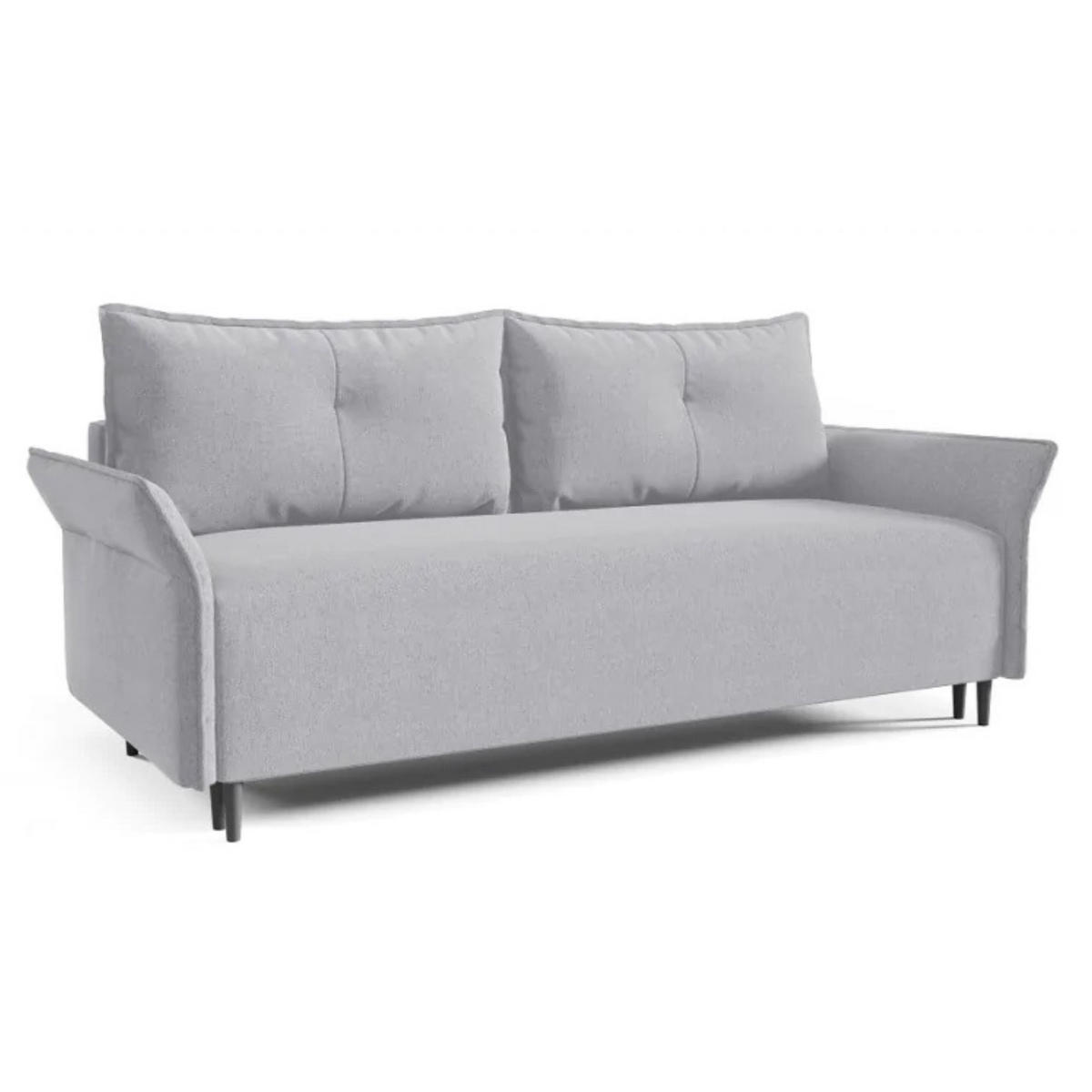 Leicht gekrümmte, dünne Seitenteile sind charakteristische Merkmale dieses Sofas, ergänzt durch schwarze Holz-Beine. Komfortables Sitzen wird durch die Füllung der Sitzflächen mit hochwertigem Schaumstoff und Bonell-Federn gewährleistet, und große Kissen bieten eine ideale und bequeme Unterstützung. Ein weiterer Vorteil des Sofas ist, dass es jederzeit in ein Bett umgewandelt werden kann, und in dem geräumigen Stauraum kann Bettwäsche verstaut werden.