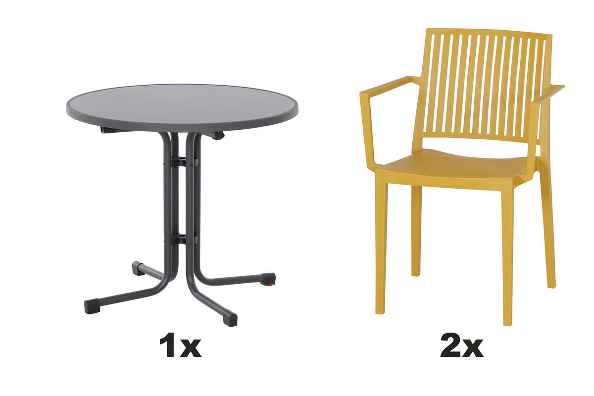- Besonderheiten: Tisch klappbar, UV-beständig, wetterbeständig, Stühle stapelbar
